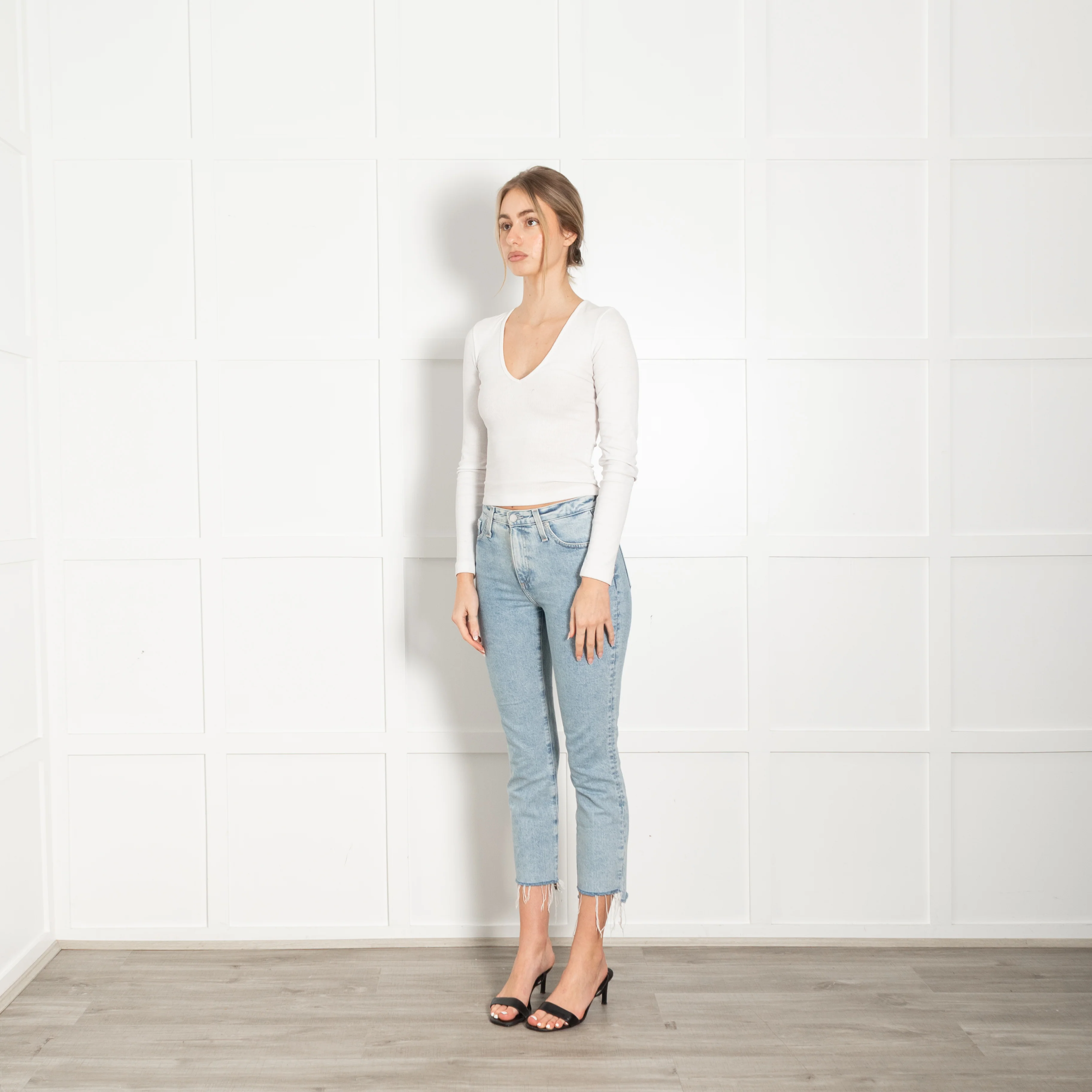 AG Jeans The Isabelle pale wash jeans with a raw hem on trouser legs, front and back pockets.