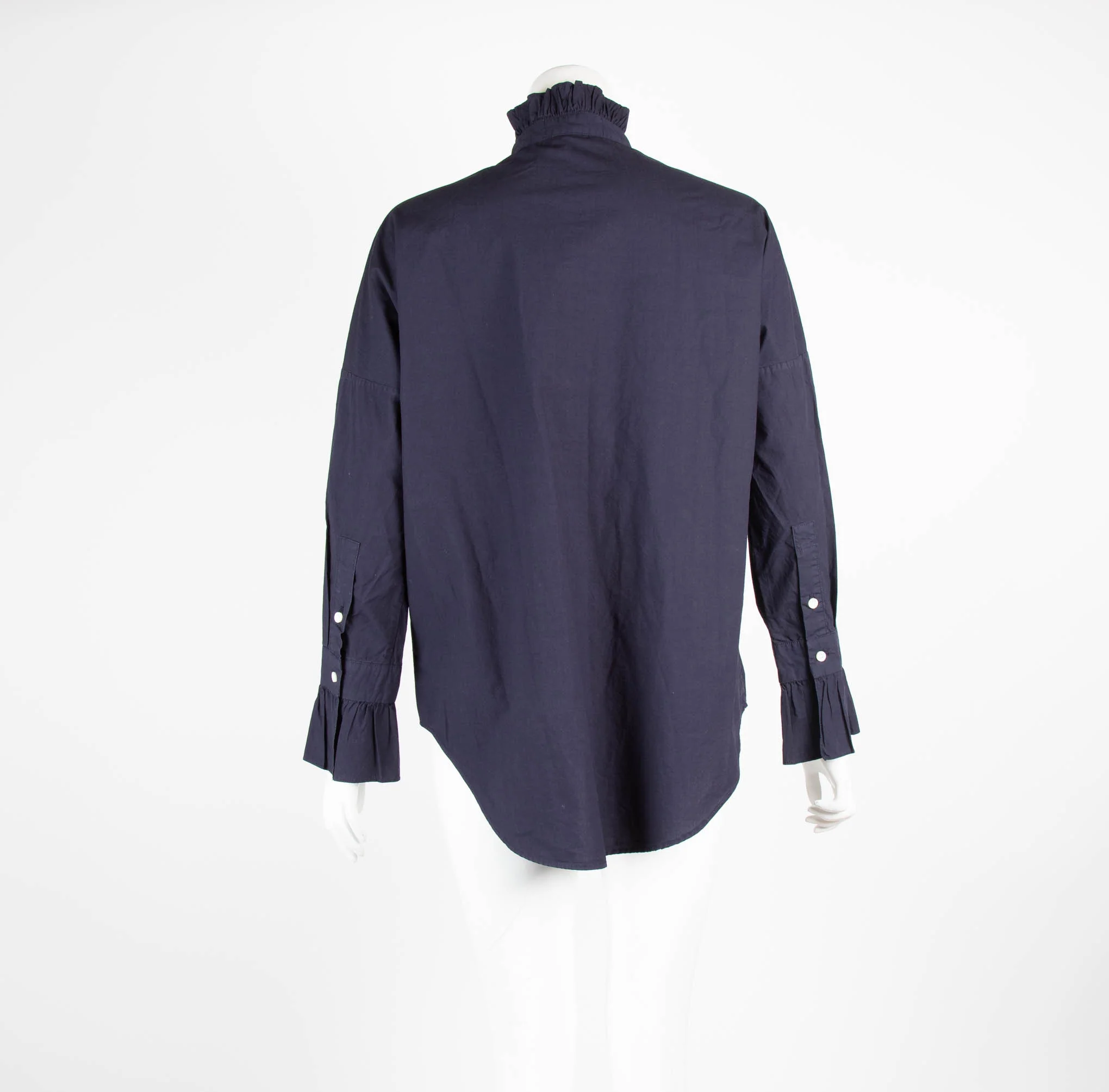 Alex Mill navy 'Easy' shirt featuring ruffled collard, cuffs, and an oversized silhouette.