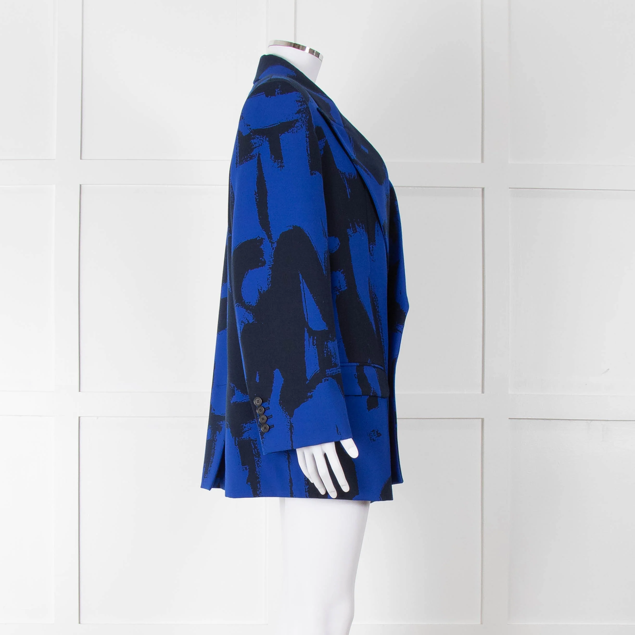 Alexander McQueen cobalt blue and black graffiti blazer with a pointed collar and lapel, front button closure, shoulder pads, and two front flap pockets.