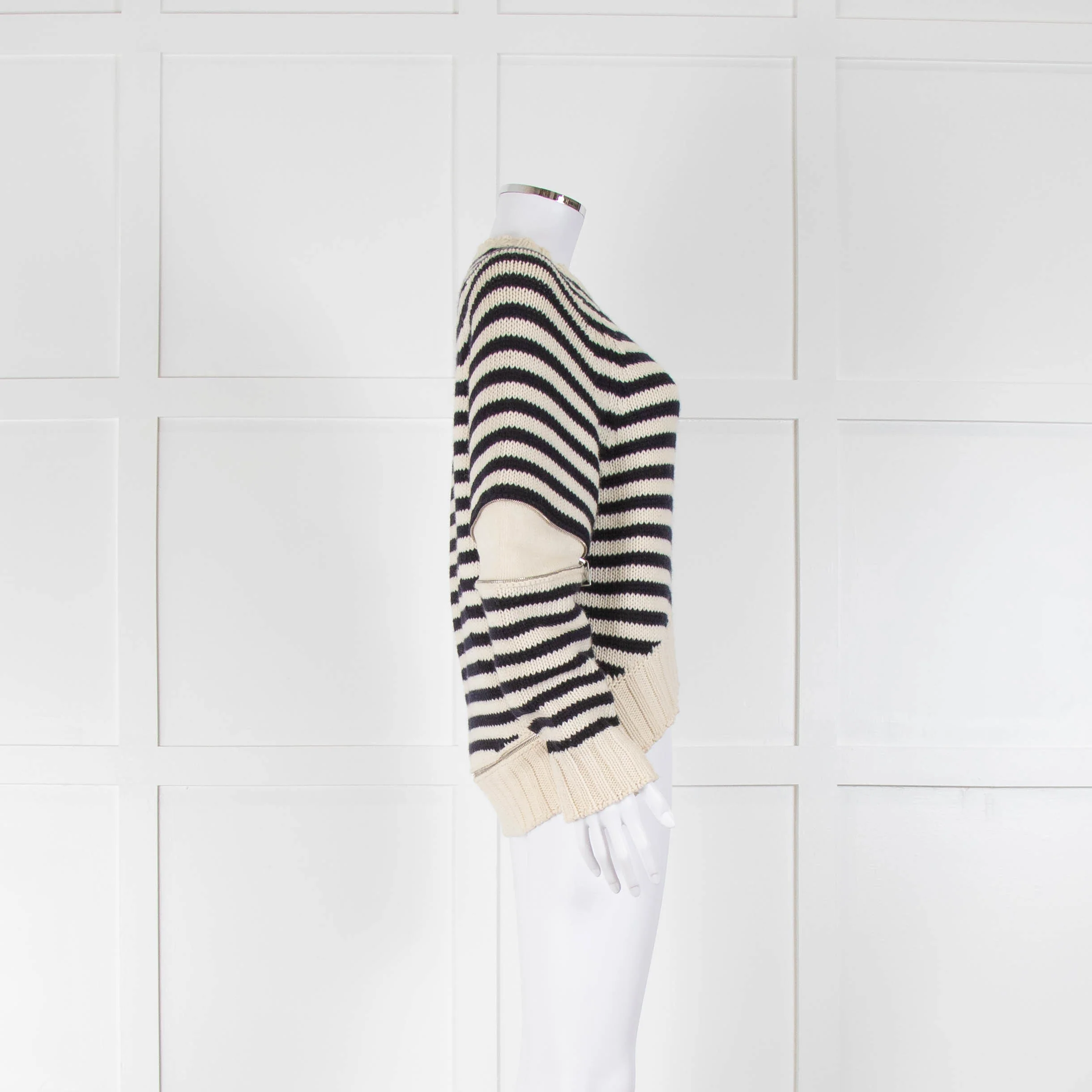 Alexander McQueen cream and navy blue chunky knit wool striped jumper with zip detailing at the back hemline, and elbows revealing a cream colour block panel. Finished with chunky ribbed trim at the neckline, cuffs, and dipped hemline.