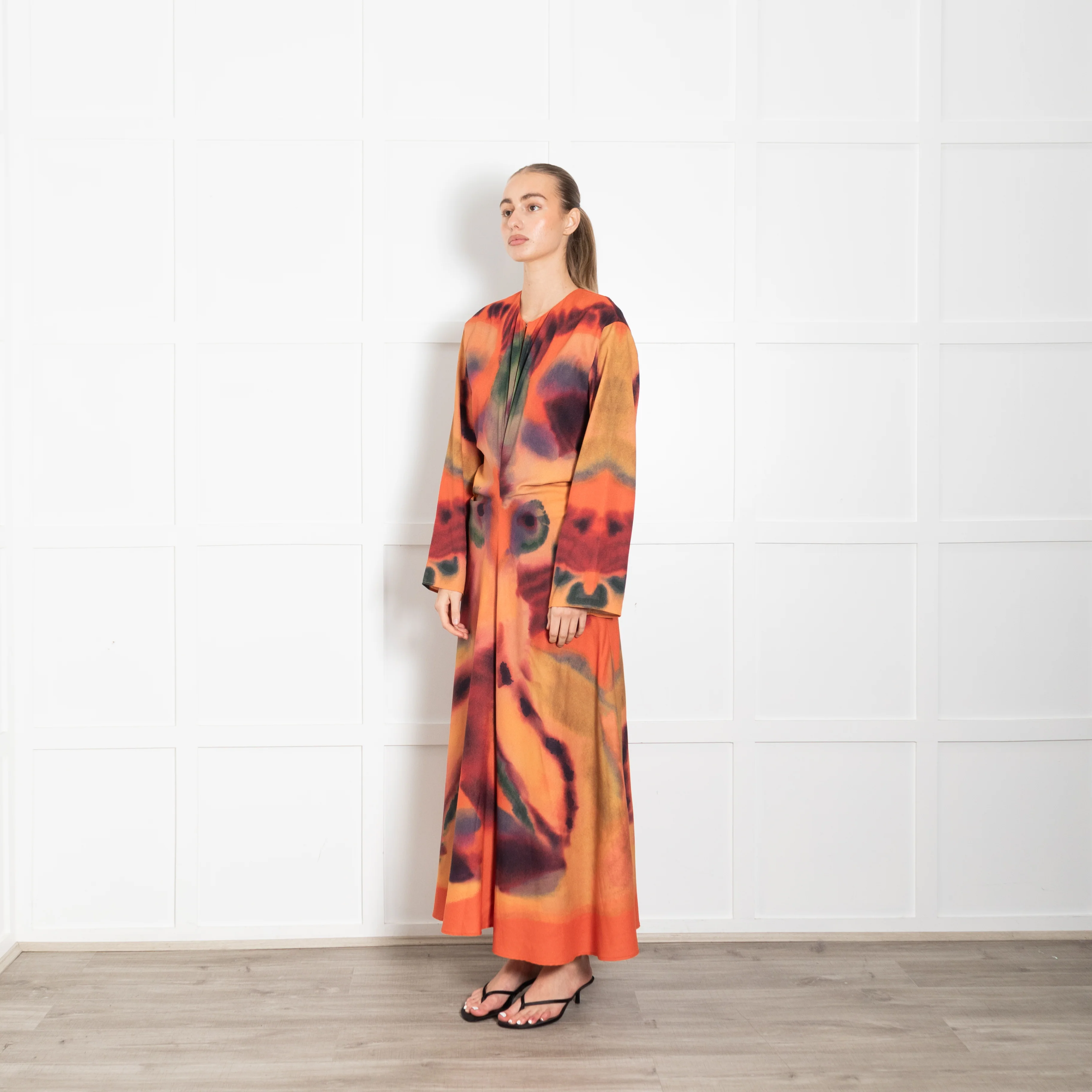 Altuzarra FW23 orange Rorschach ink print maxi dress with long sleeves, round neck with hook and eye fastening, keyhole cutout, and an invisible zip down the back. This dress is fully lined and cut to have a slight stretch in the body. New with tags.