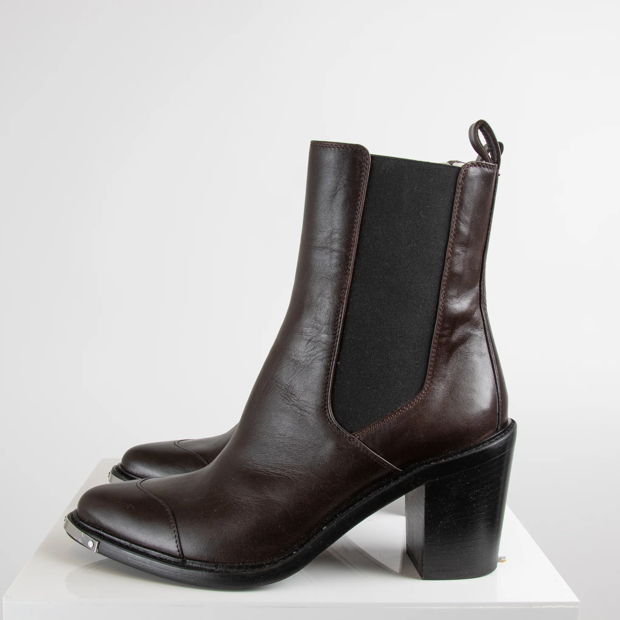 Belstaff chocolate brown Aviland boots. In smooth leather with elasticated ankles and metal toe stud detail. Accompanied by the original box.