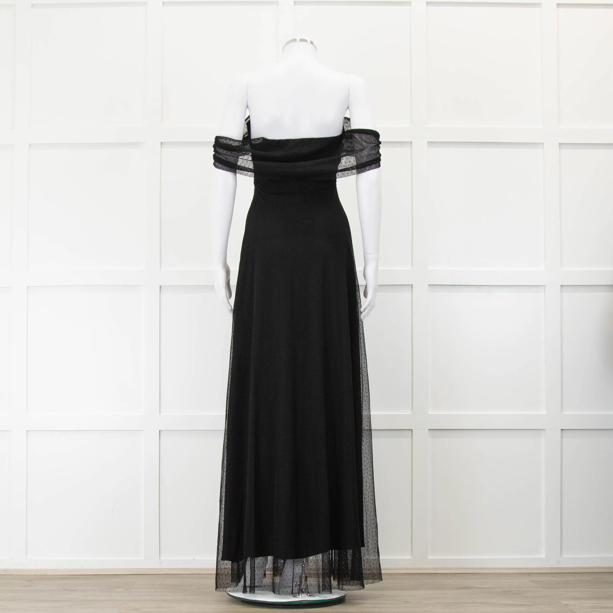 Bernadette black spotty net maxi dress with a white flower embellishment on the front, an elasticated top, draped off-the-shoulder straps, and a full silk lining. New with tags.