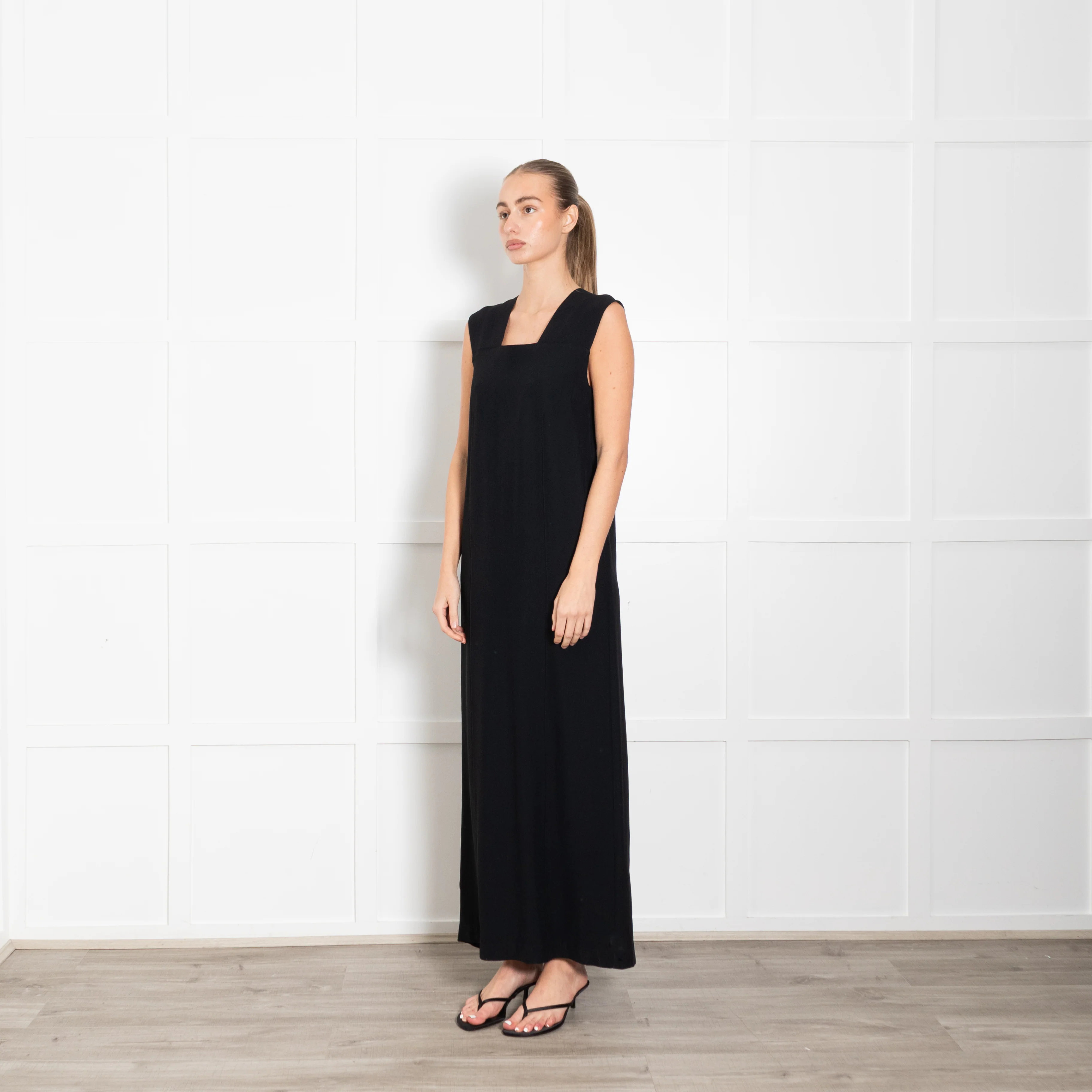 Bite Studio black satin-backed crepe maxi dress, straight cut with wide shoulder straps and an invisible zip at the back. New with tags.