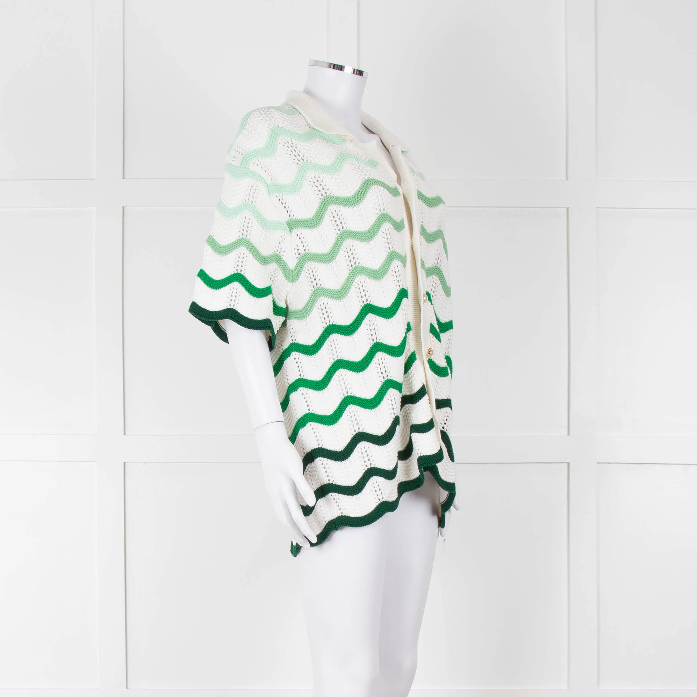 Casablanca unisex (Men's) green and white gradient wave knit textured shirt with a small pointed collar, short sleeves, a small red branded patch on the front, and pearl embellished buttons down the front. The matching shorts are available separately. New with tags, current season RRP €610.