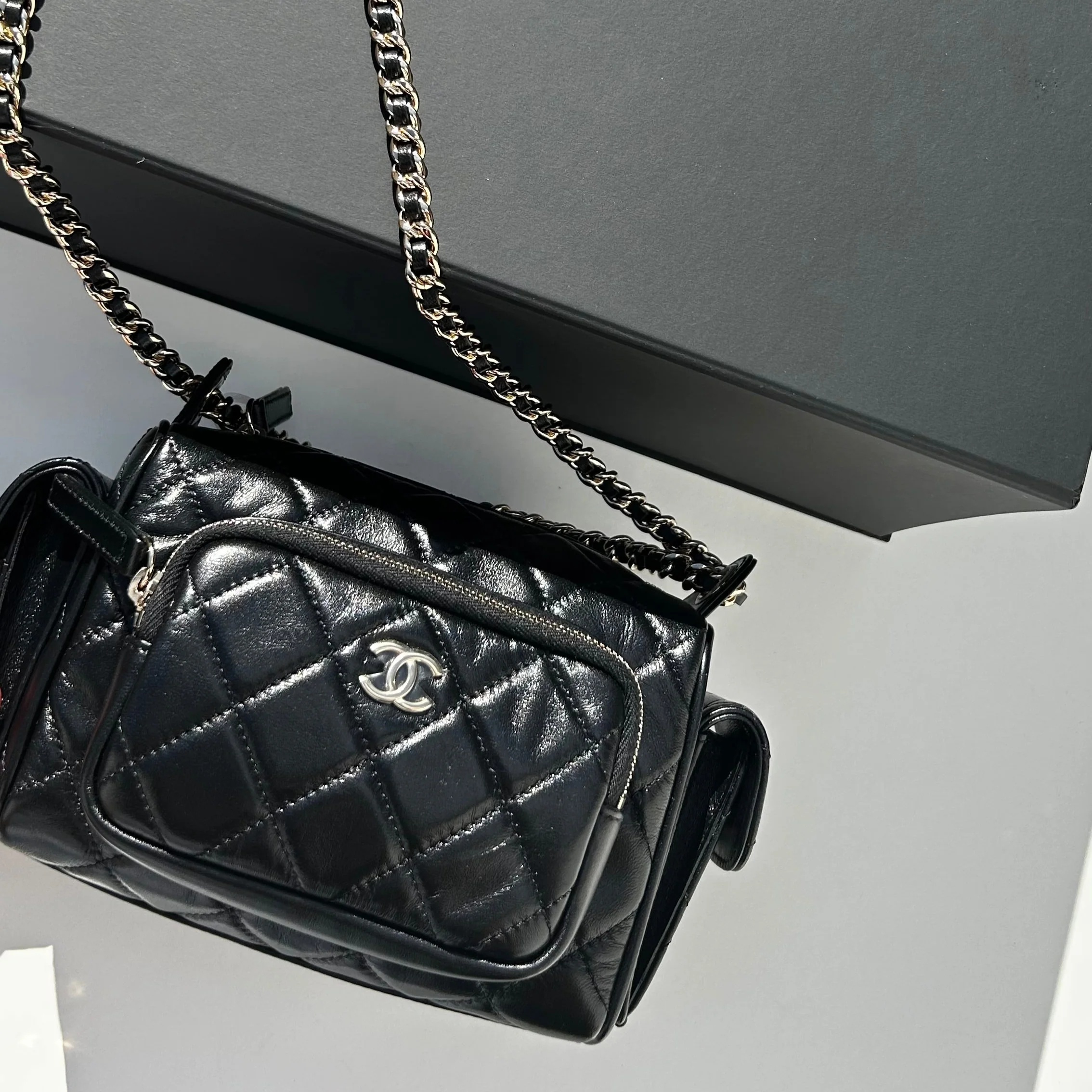 Chanel (2024) small camera bag in black quilted lambskin leather with gold tone metal hardware. This bag features one main zip compartment with the signature CC logo embelishment, two zip pockets at the front and rear of the bag, and two side flap pockets with metal pop-clip closure. The interwoven chain strap is adjustable through two metal eyelets on either side of the bag.