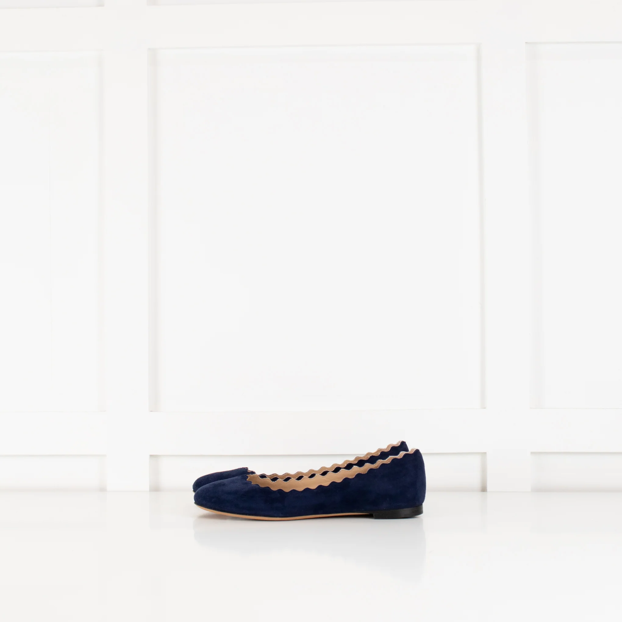 Chloe navy blue suede ballet pumps with scalloped edge detailing, a soft round toe, small stacked leather heel, branded leather footbeds, and leather soles. Accompanied by a Chloe dust bag.