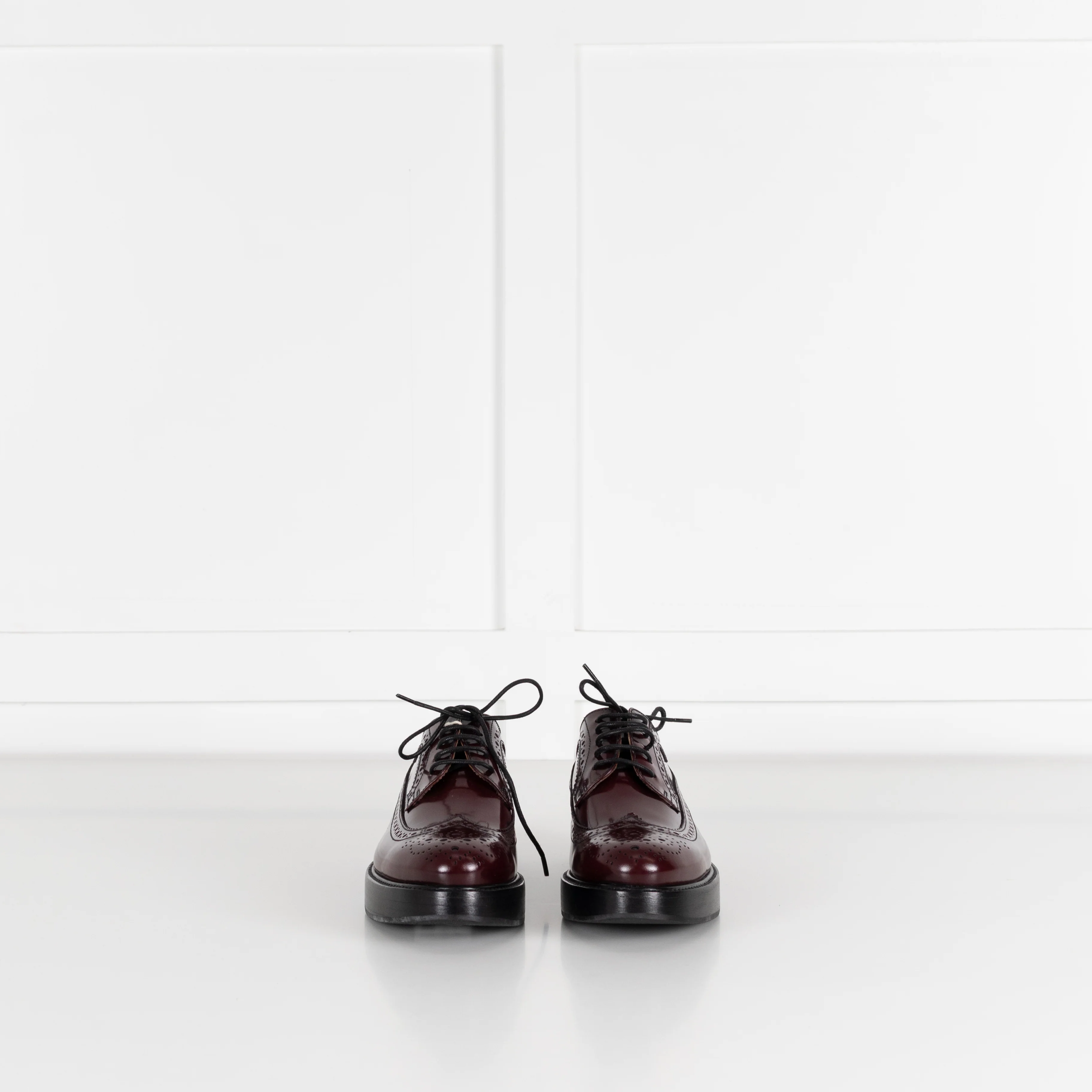 Church's burgundy wingtip brogue leather shoes featuring a small platform of 2cm. The shoes are crafted from polished Fume Calf leather. Accompanied by original box and dust bag.