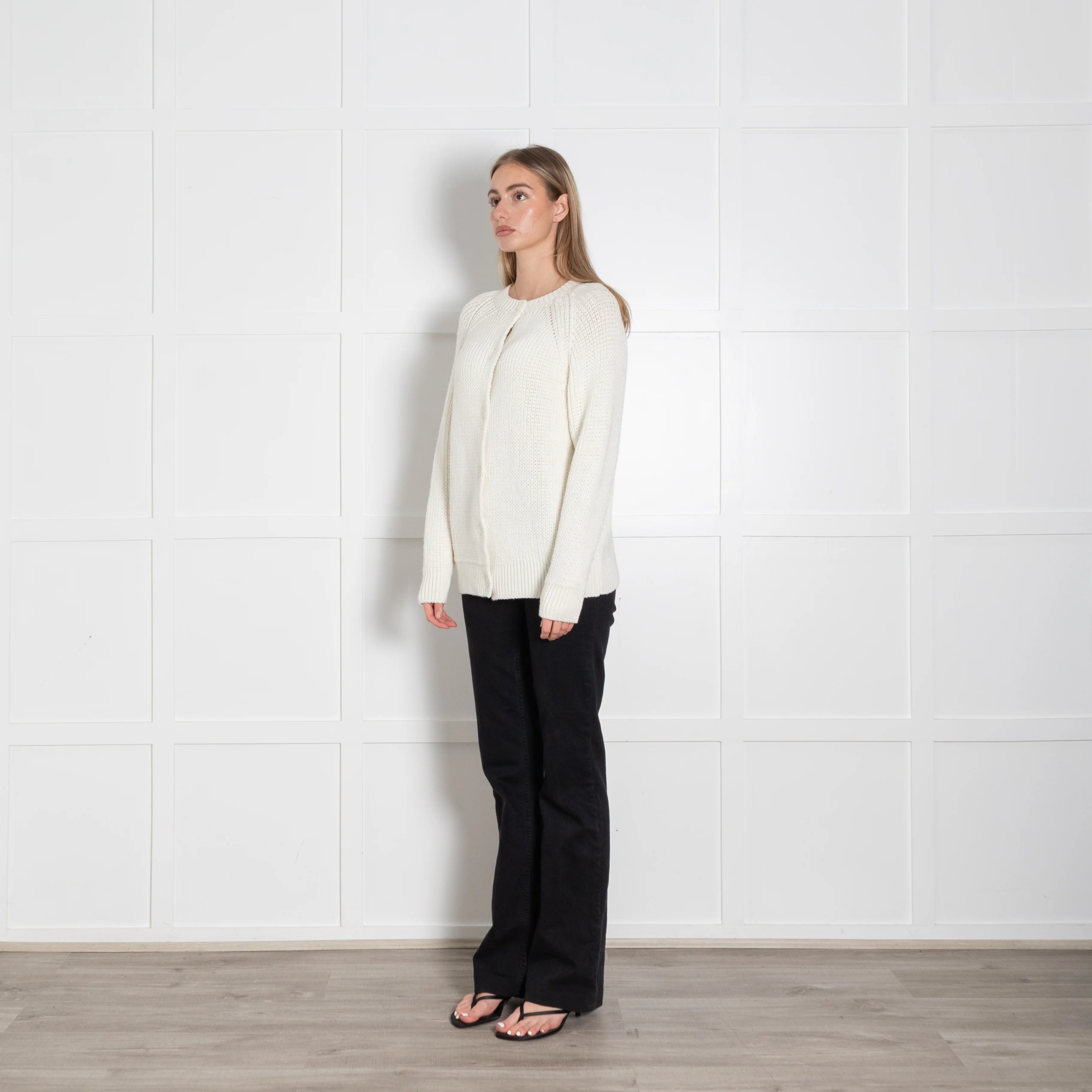 &Daughter white, wool, open weave cardigan with ribbed rounded neckline, sleeve cuffs and hem, and ribbed shoulder seam detail. Featuring white, pearlescent buttons.