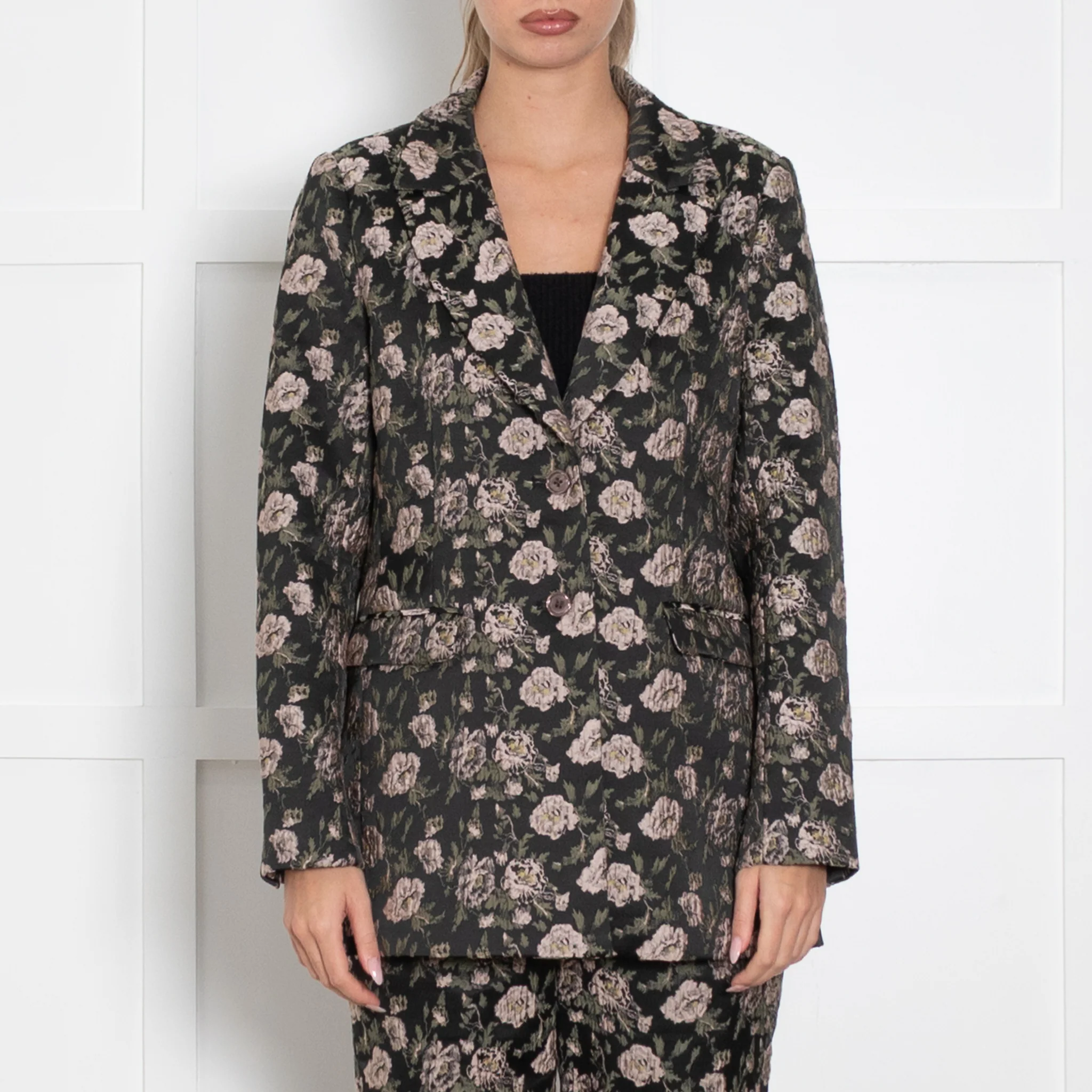 Dea Kudibal elegant trouser suit, featuring a stunning green and pastel pink floral print on both the trousers and blazer, crafted with a textured, straight-fit design, with split cuff trousers. The blazer features a classic collar with two front flaps, and the trousers are crafted with a zip-up and button-up closure.