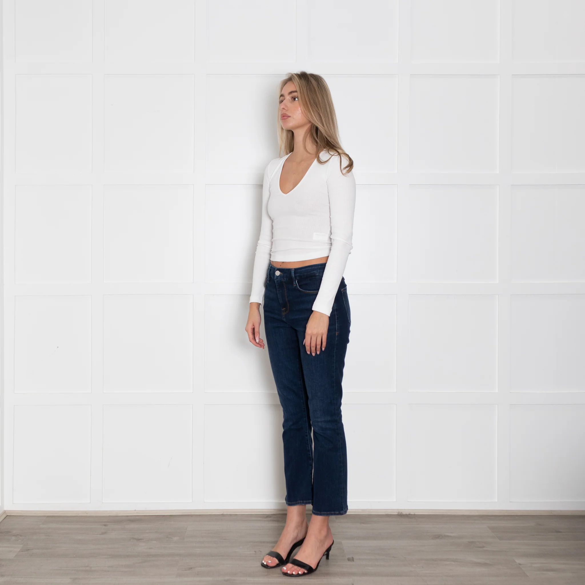 Frame dark blue denim 'Le Crop Mini Boot' jeans. A bootcut silhouette featuring a dark blue wash. RRP £235.00.