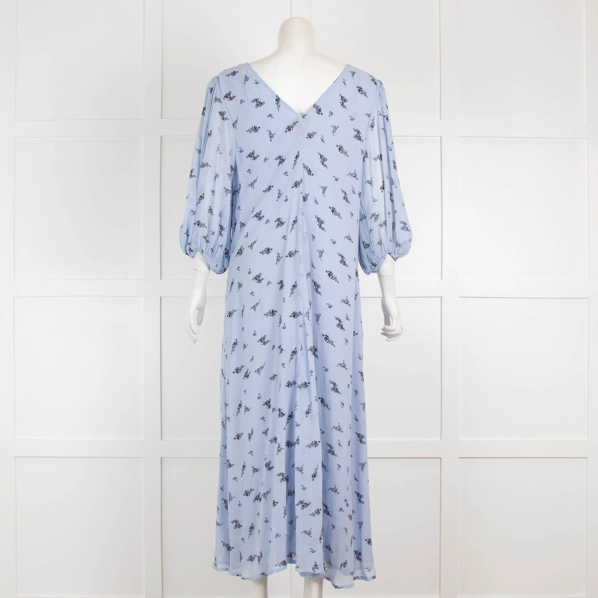 Ganni pale blue maxi smock dress with 3/4 length puff sleeves, v back and neckline, and black floral motifs throughout.