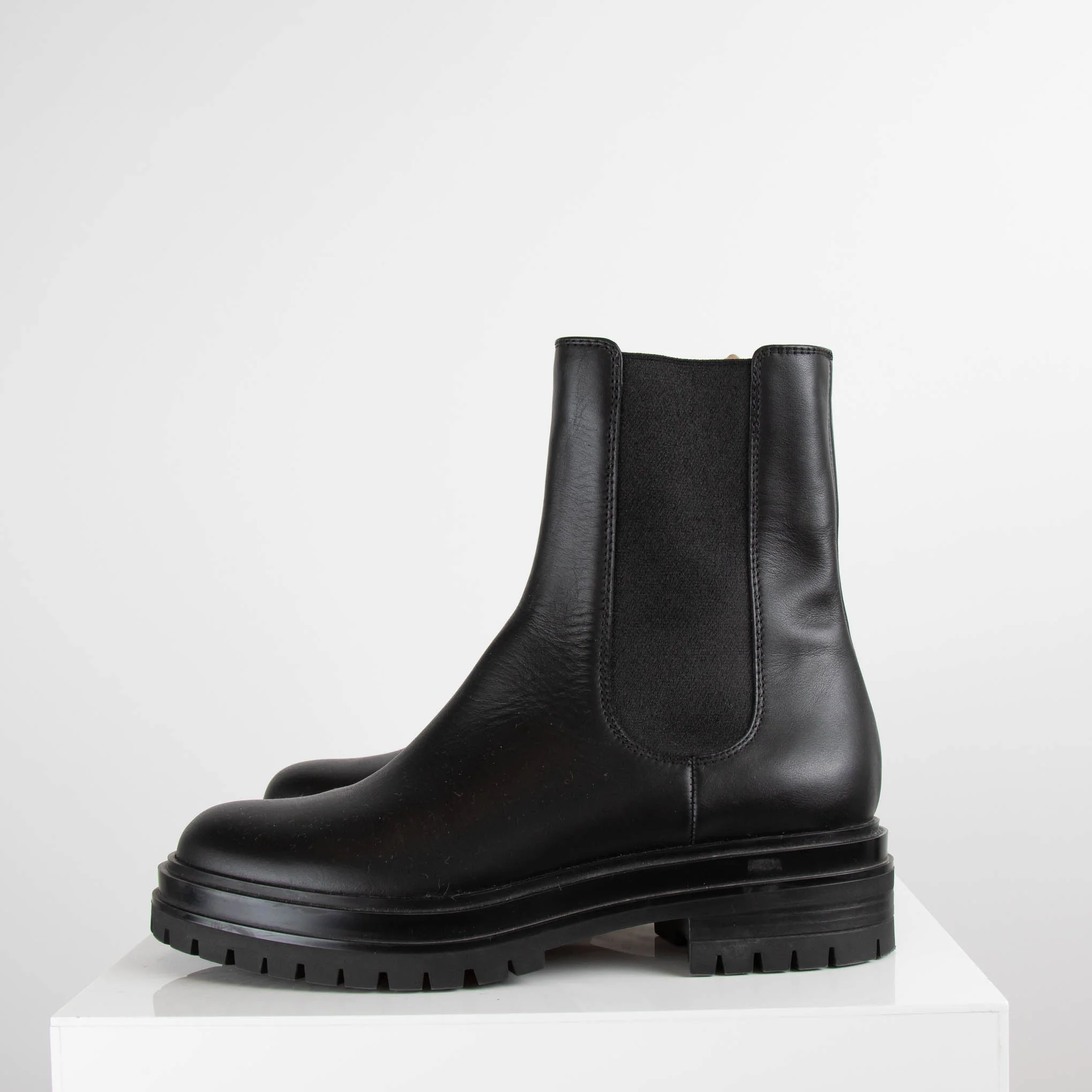 Gianvito Rossi Chester black chunky Chelsea boots. Made from smooth black leather with elasticated side tabs and set on a chunky rubber sole. Accompanied by the original dust bags.