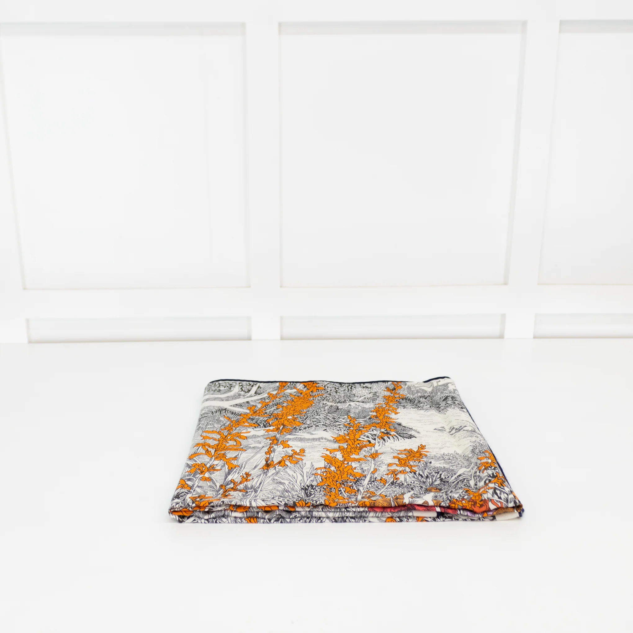 Hermes cashmere and silk mix twill scarf/ shawl in the Retour A La Nature print with hand-rolled hems.