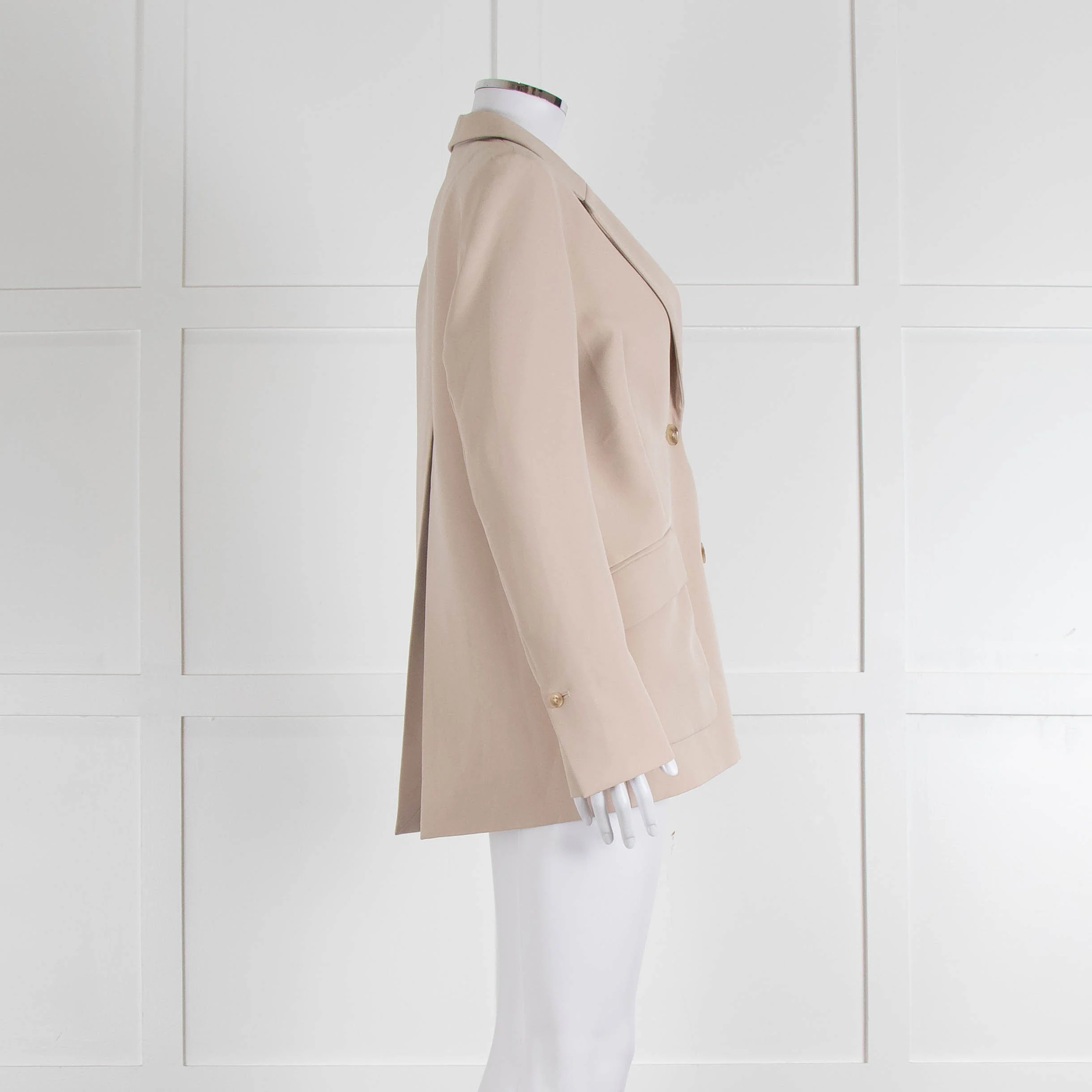 Holzweiler neutral split back front pocket detail blazer jacket with a pointed collar and lapel, front button closure, and front flap pockets. This jacket also features a large rear hem split.