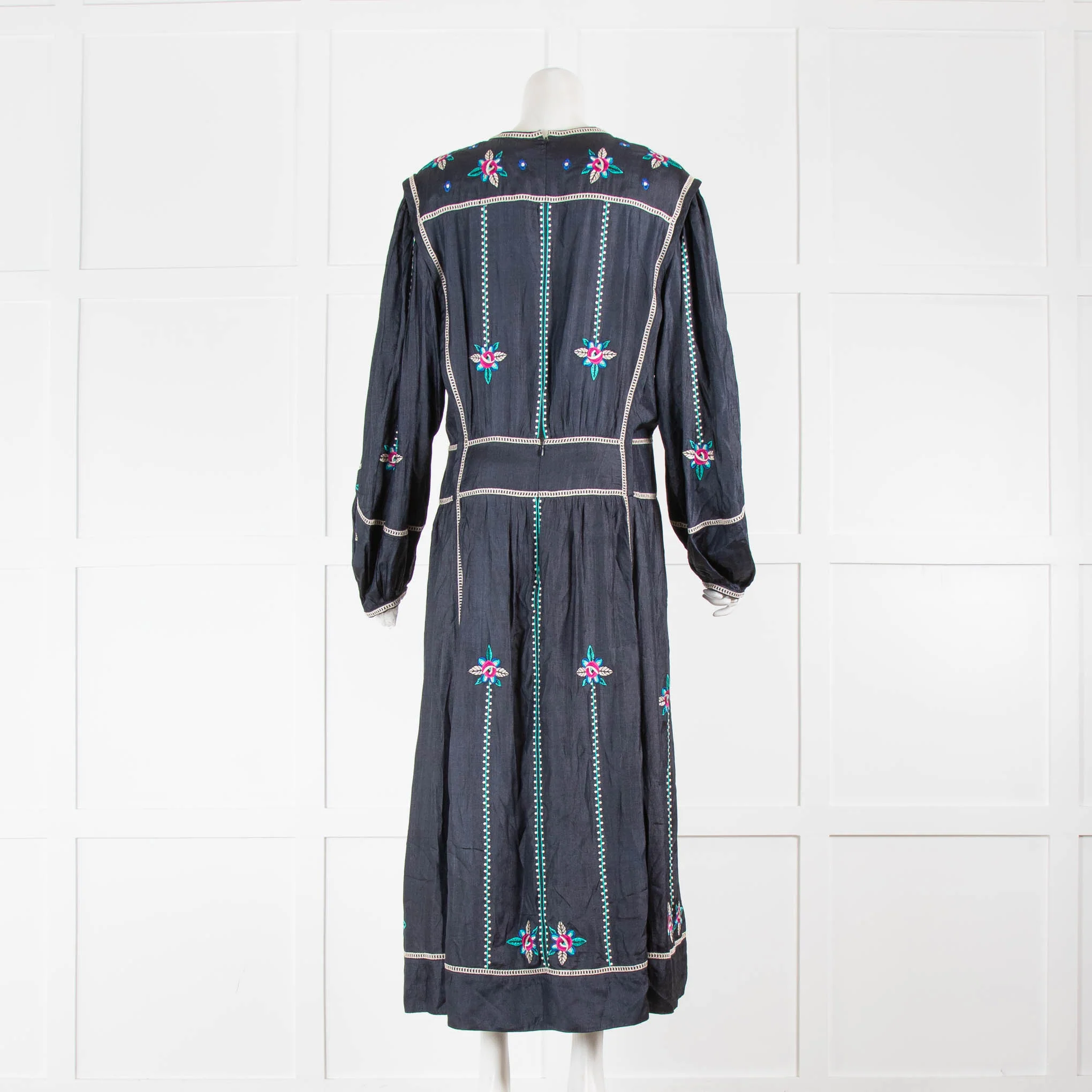 Isabel Marant navy silk floral embroidered dress with cross stitch. This dress is fully lined with long sleeves gathered into the wrists and a round neckline. New with tags.