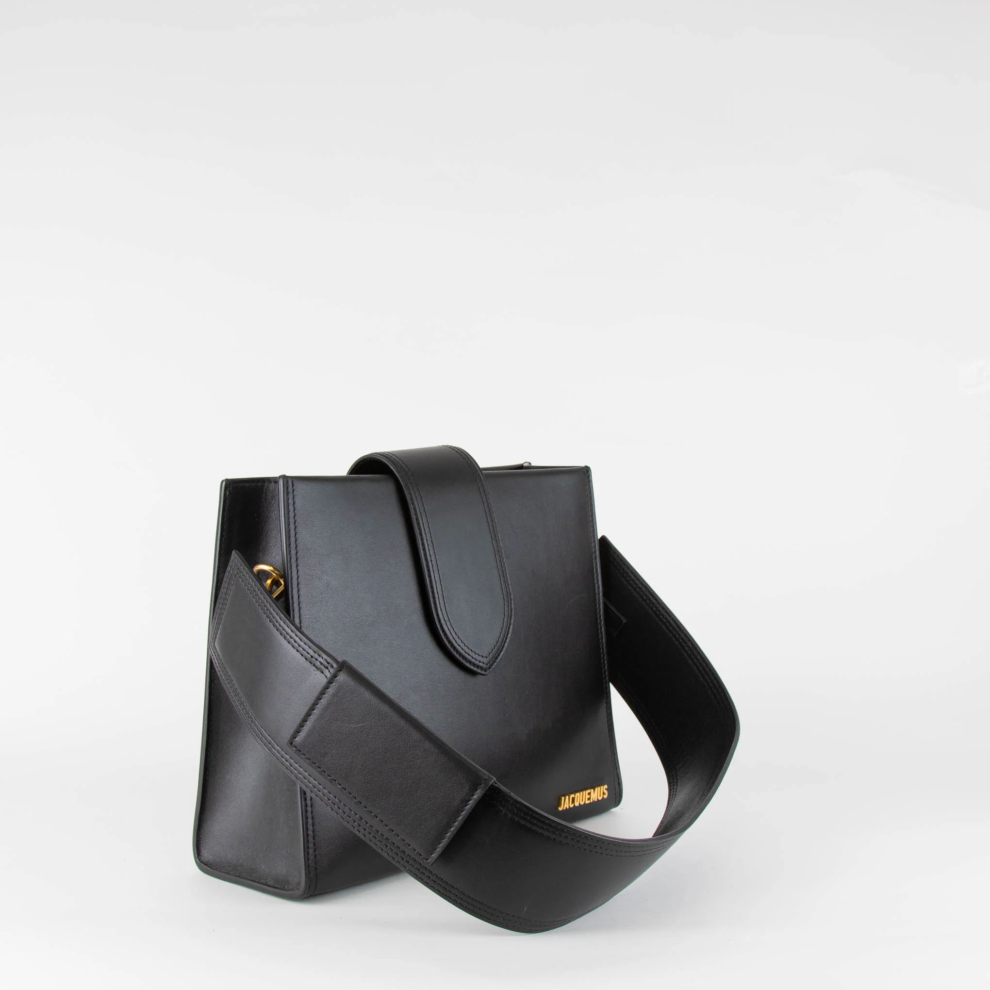 Jacquemus black Le Bambino 24 leather shoulder bag. Crafted from smooth black leather, with gold-tone hardware, a detachable wide leather shoulder strap with card pockets, and magnetic flap closure. Has one main compartment and one small side slip pocket. Accompanied by the original dust bag and is new with tags.