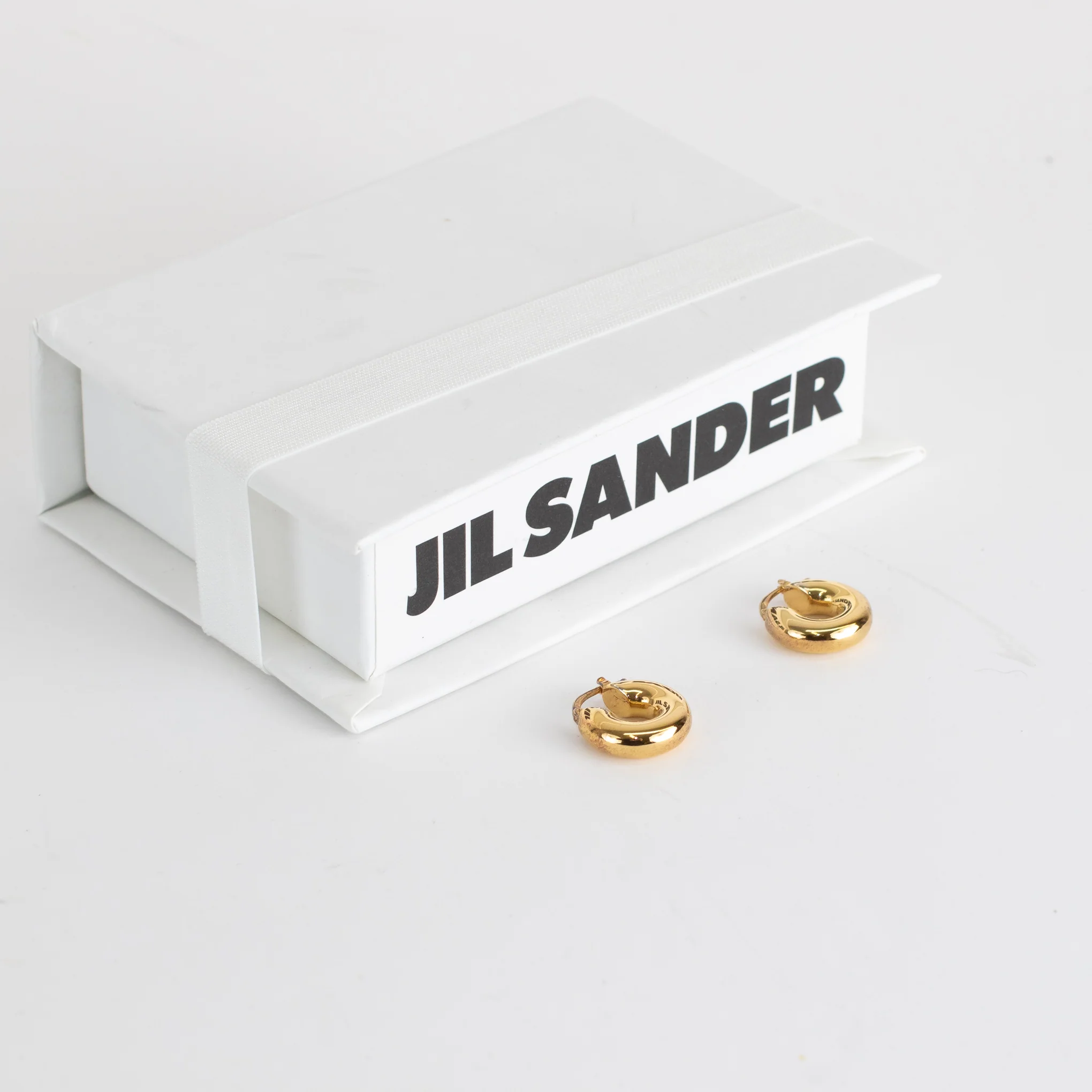 Jil Sander classic round earrings in gold. Crafted from polished brass these earrings are suitable for pierced ears with hinged hook fastenings, and jil sander branded engraving on the back. New with tags, accompanied by the original dust bag and box RRP £325.