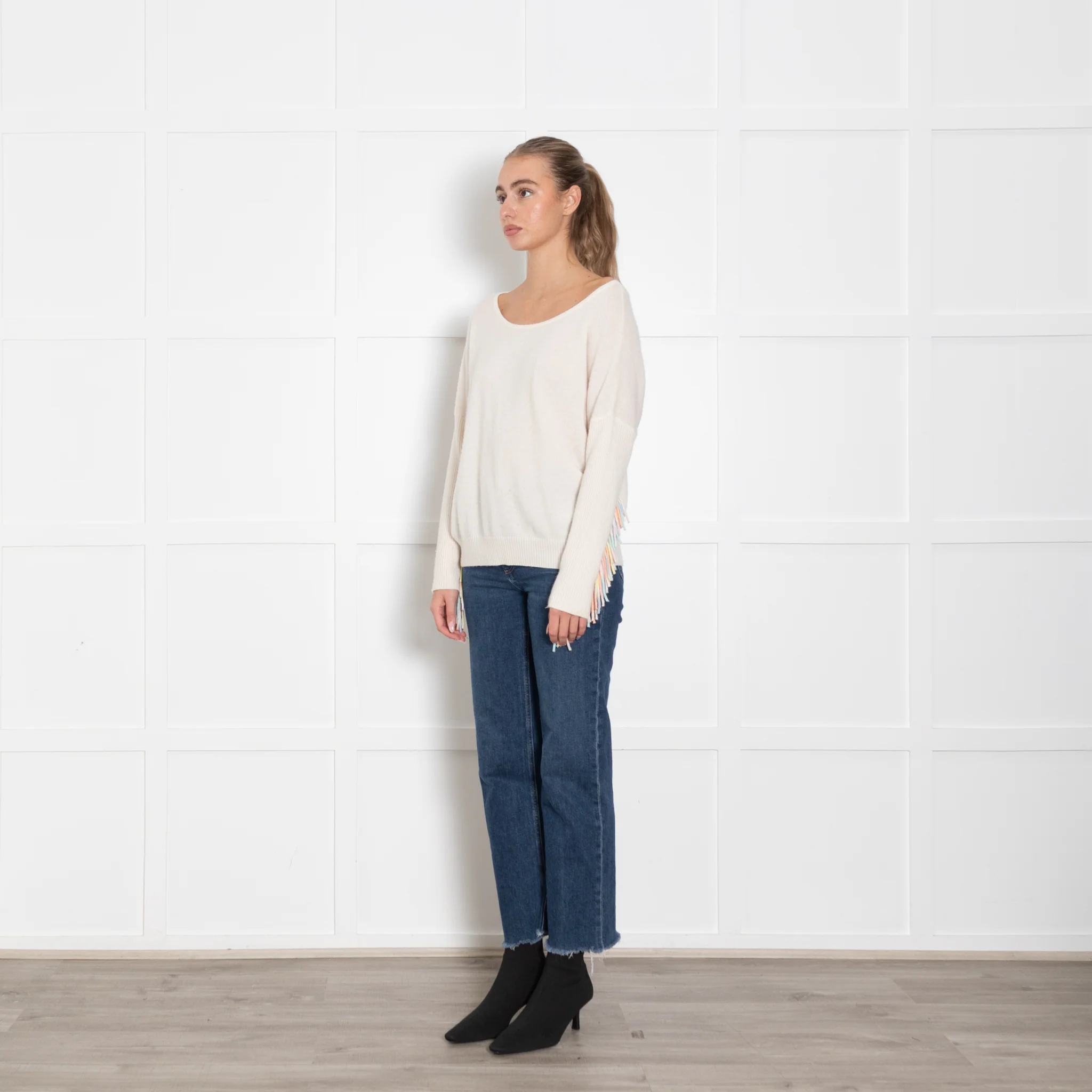Kujten Cream Cashmere Jumper With Pastel Fringed Sleeves