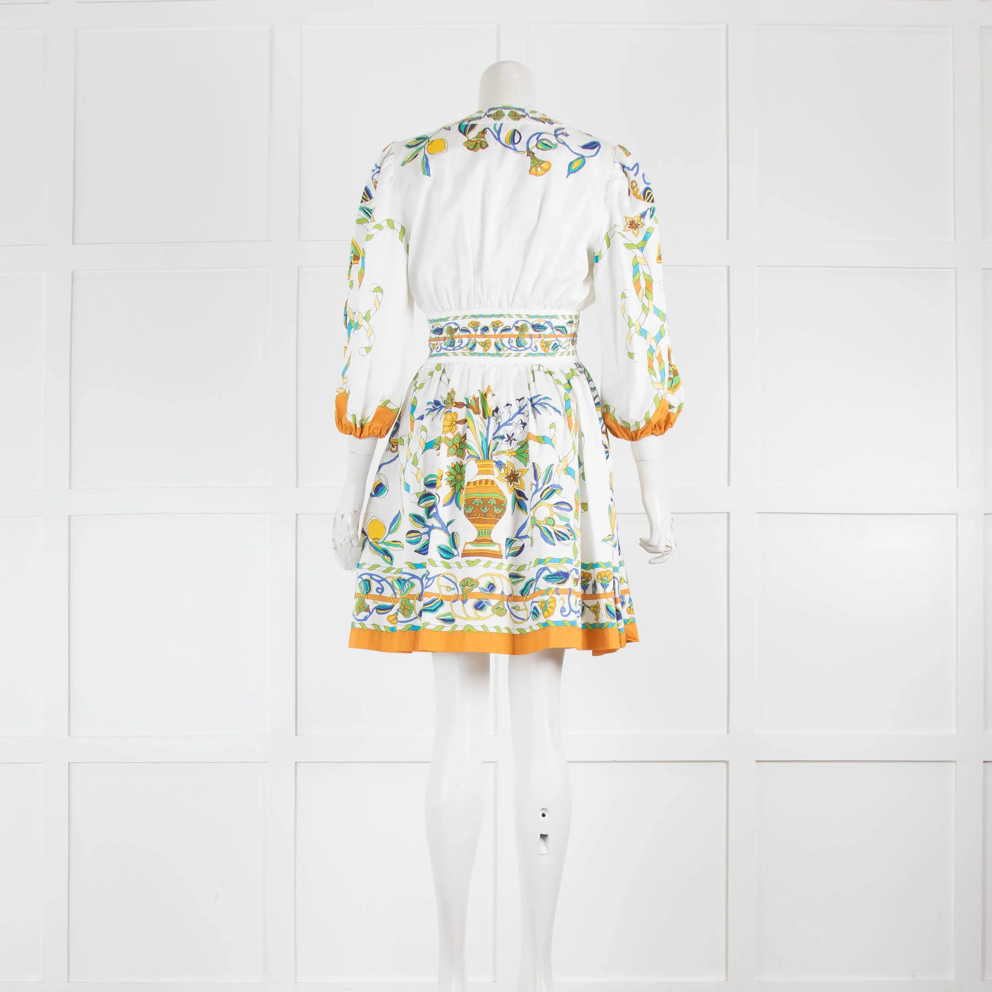 La Double J Margherita white short dress in a multicolour floral pattern with birds. This dress has three-quarter-length puff sleeves, a V neckline, a gathered skirt with side pockets, and a thick waistband.