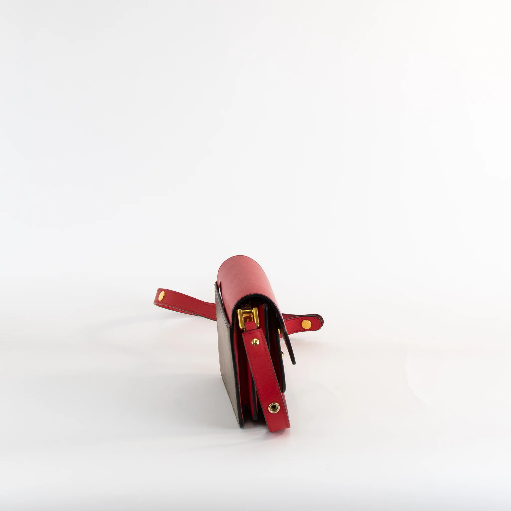Marni mini tri-colour red, grey, and taupe leather and suede trunk bag featuring an extendable popper strap, gold hardware, and front flap opening with a push lock fastening. Opening onto a central zipped pouch and two open compartments. Additional front pocket underneath the flap and flat back pocket.