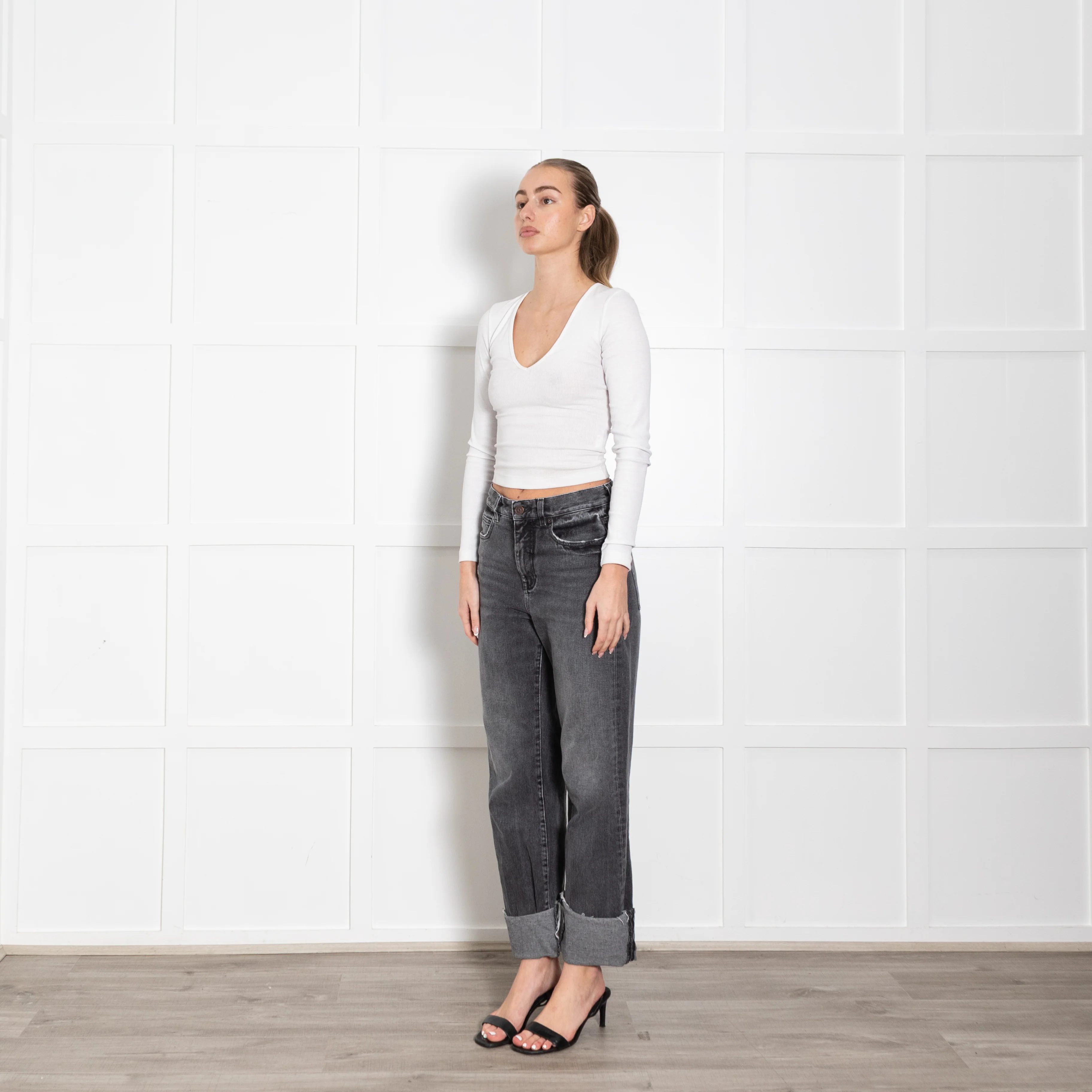 Me +Em grey denim ankle grazer jeans with a turn-up leg feature.