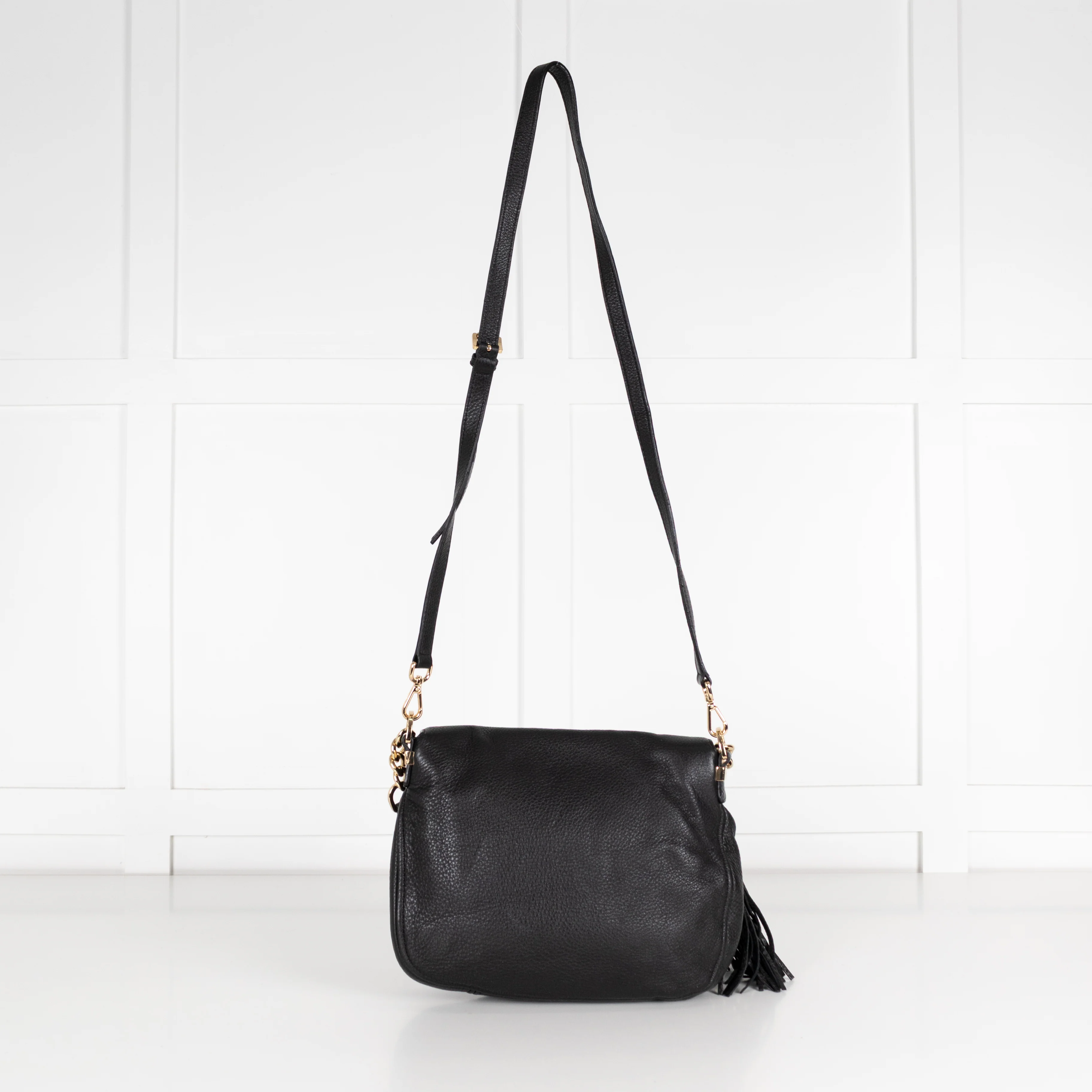 Michael By Michael Kors black pebbled leather bag with gold hardware. This bag features a tassel zip closure on the top flap, a short and long hande and internal pockets.