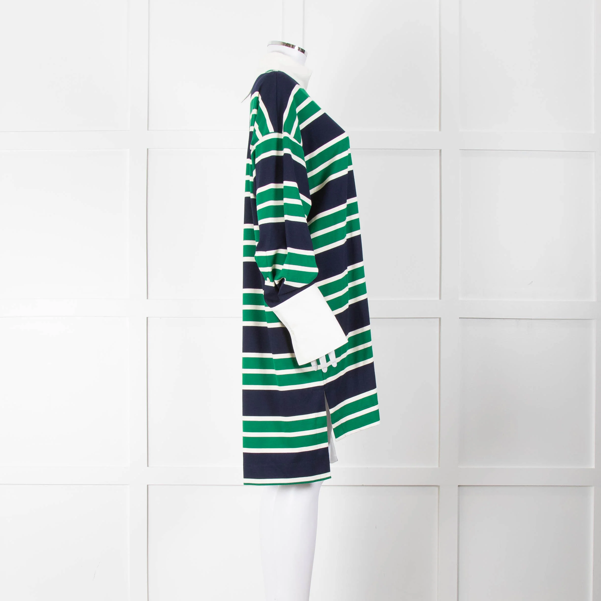 Monse navy blue and green striped rugby shirt style dress crafted in a fine knitted jersey with long sleeves, buttoned cuffs, and side hem splits with a staggered hemline. This dress has asymmetric detailing with the traditional collar fastening with buttons over the shoulder. New with tags.