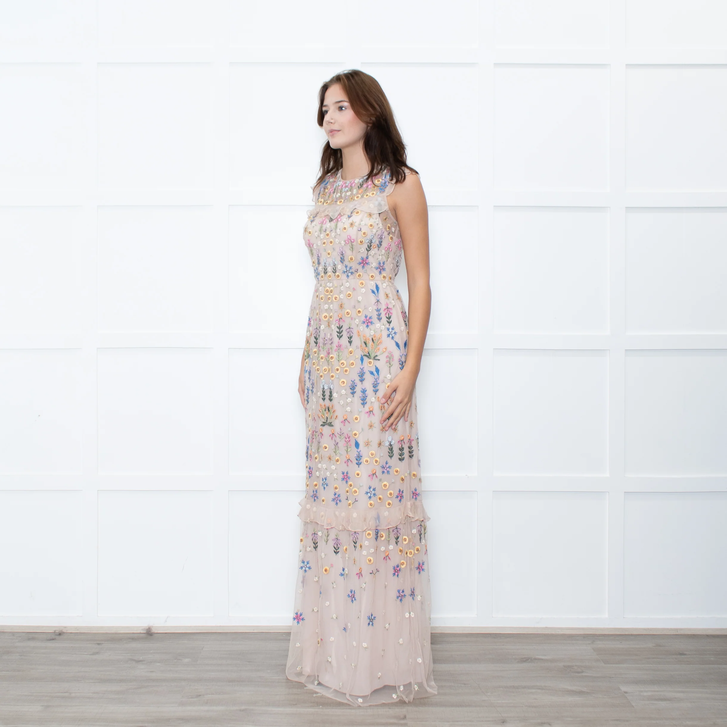 Needle & Thread powder pink mesh net maxi dress with multicoloured floral embroidery all over. Featuring frilled detailing, a two-tiered skirt, and a matching slip dress. New with tags.