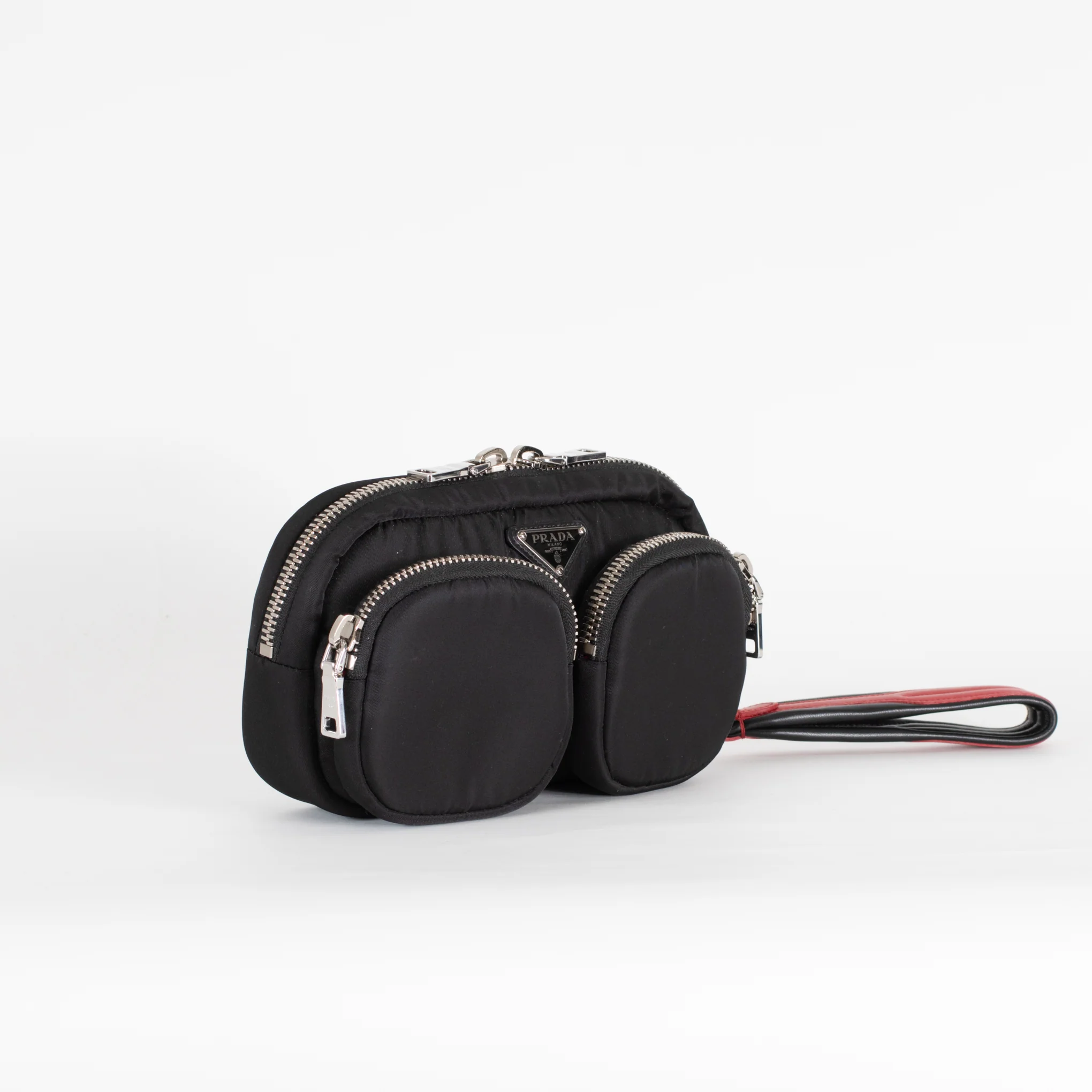 Prada black padded nylon wristlet with two front accent pockets, chunky silver zips, a Prada triangle plaque on the front of the bag, and a clip on red leather wrist strap. This bag is lined in contrasting bright red nylon. Accompanied by the original dust bag.