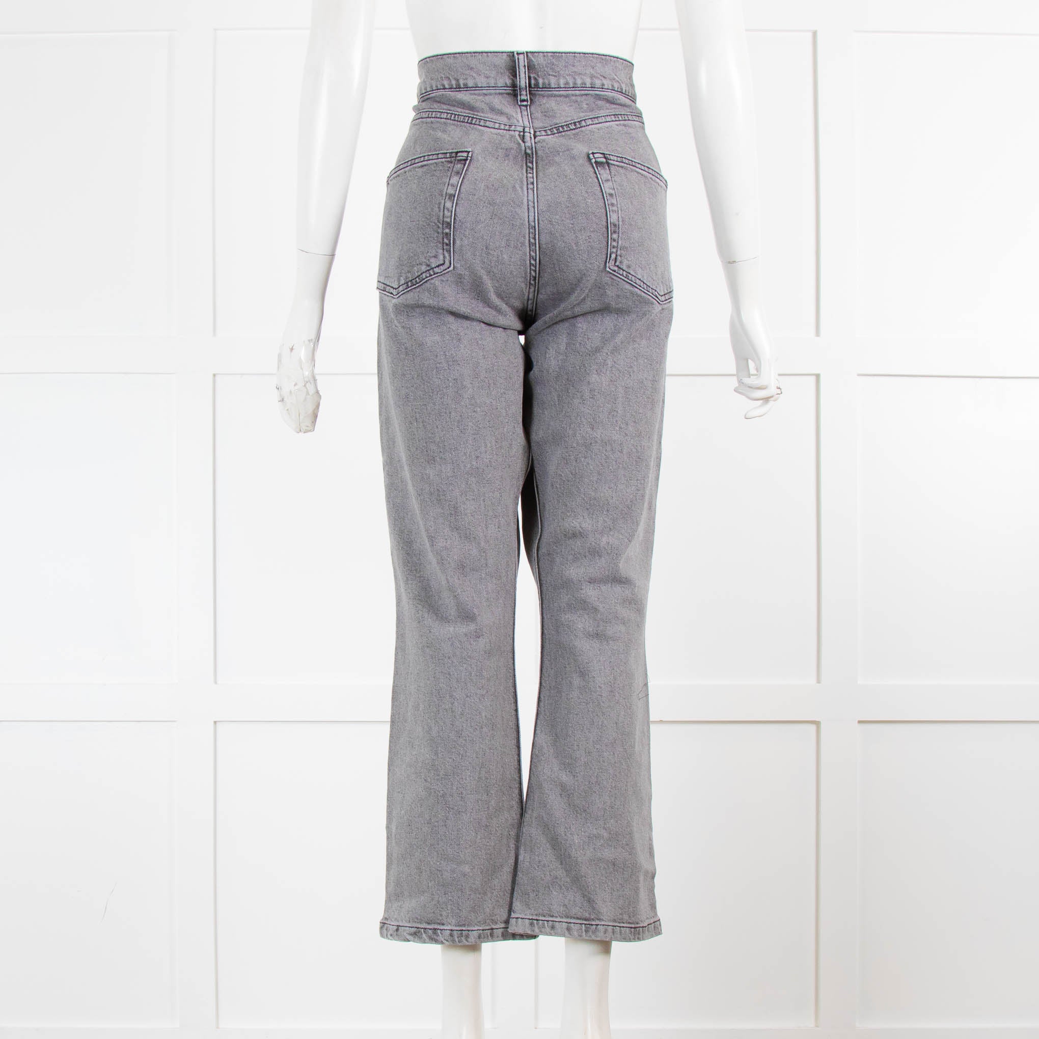 Raey grey wash, straight-leg jeans. Featuring five pockets, belt loops, contrasting black stitching, and concealed button fastenings.