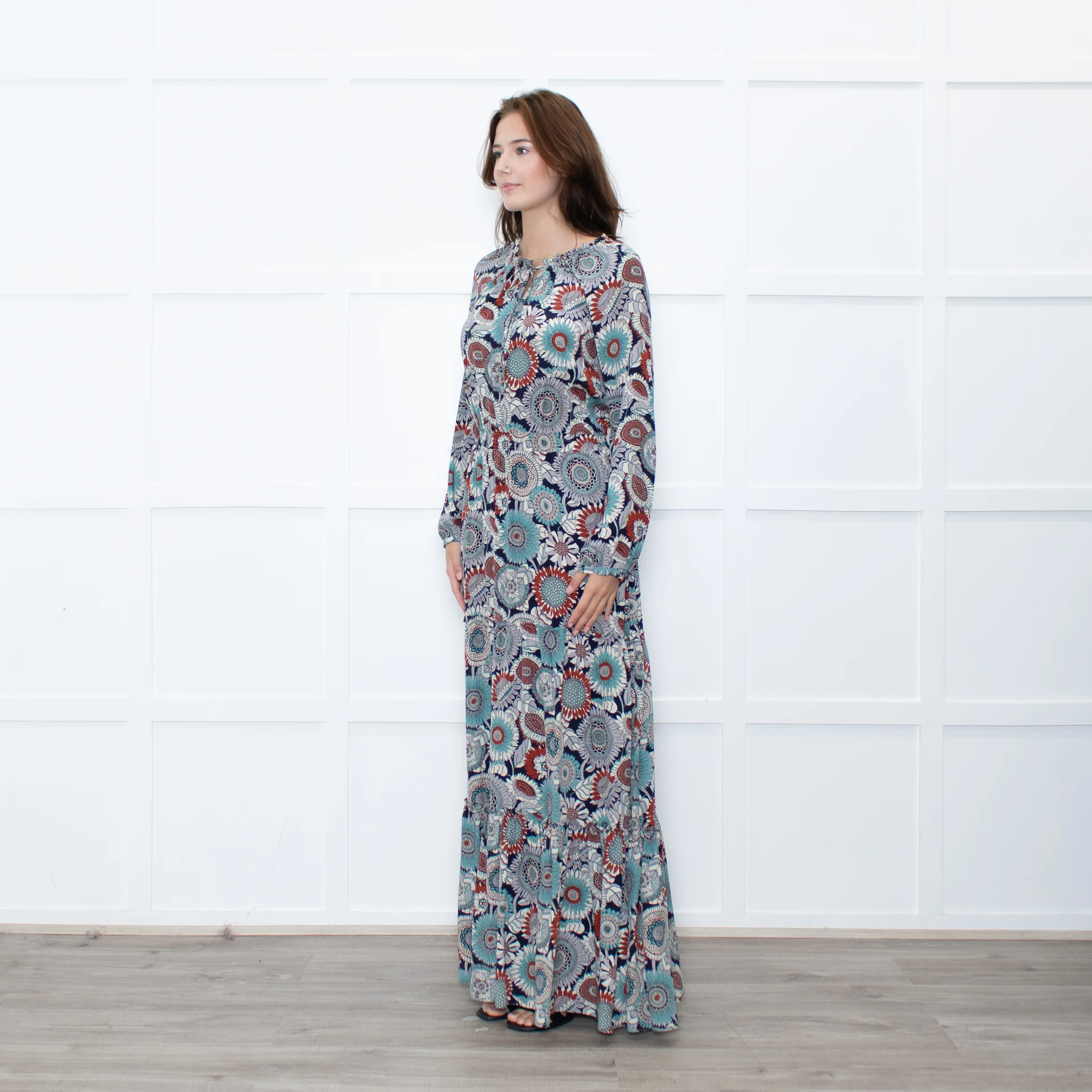 Ridley Navy Multicolour Floral Print Silk Long Sleeve Maxi Dress