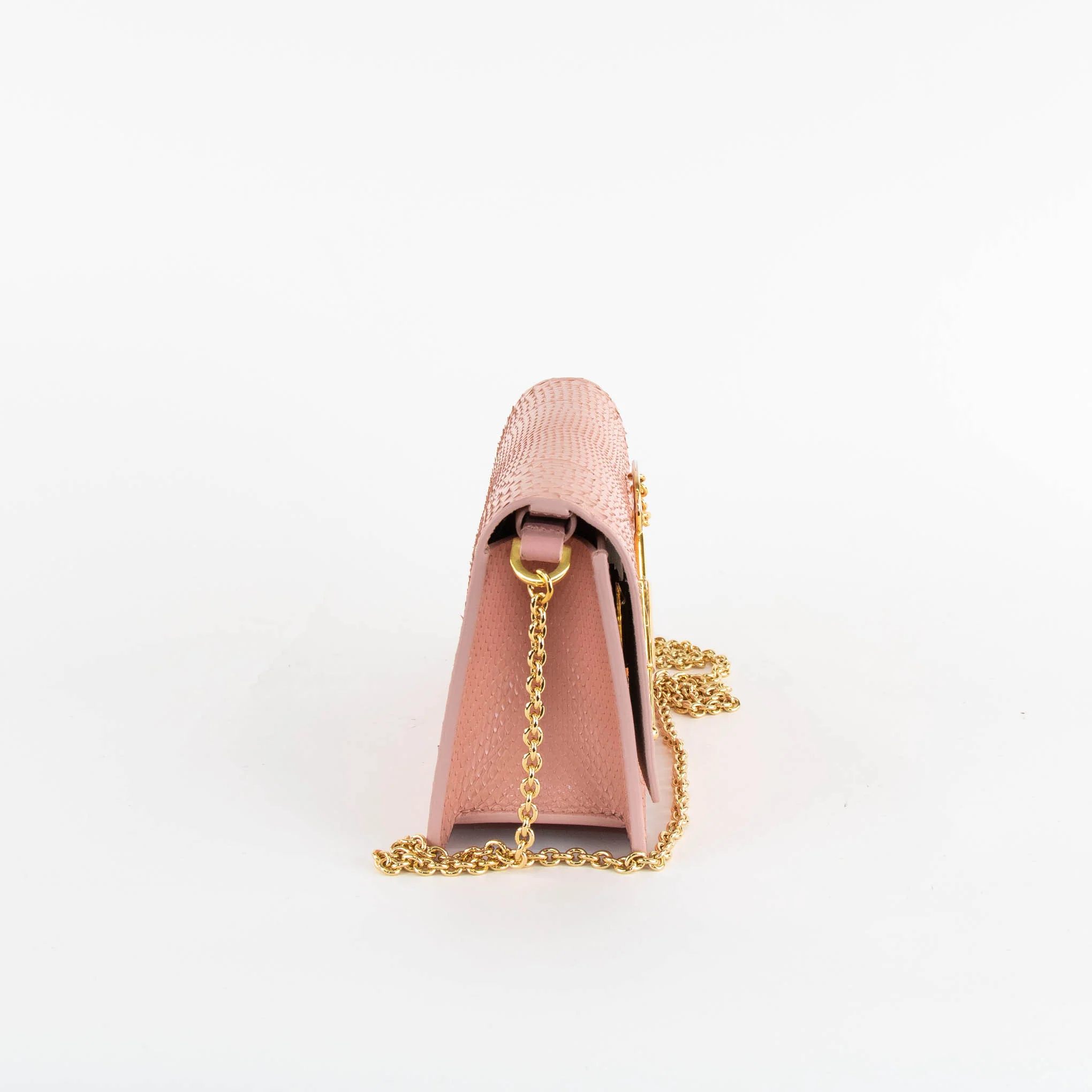 Sophie Hulme salmon pink exotic snakeskin leather bag. Gold hardware with a cross-body chain strap and a cocktail stirrer clasp. Opening onto one main compartment with a small interior pocket. New with tags accompanied with original dust bag.