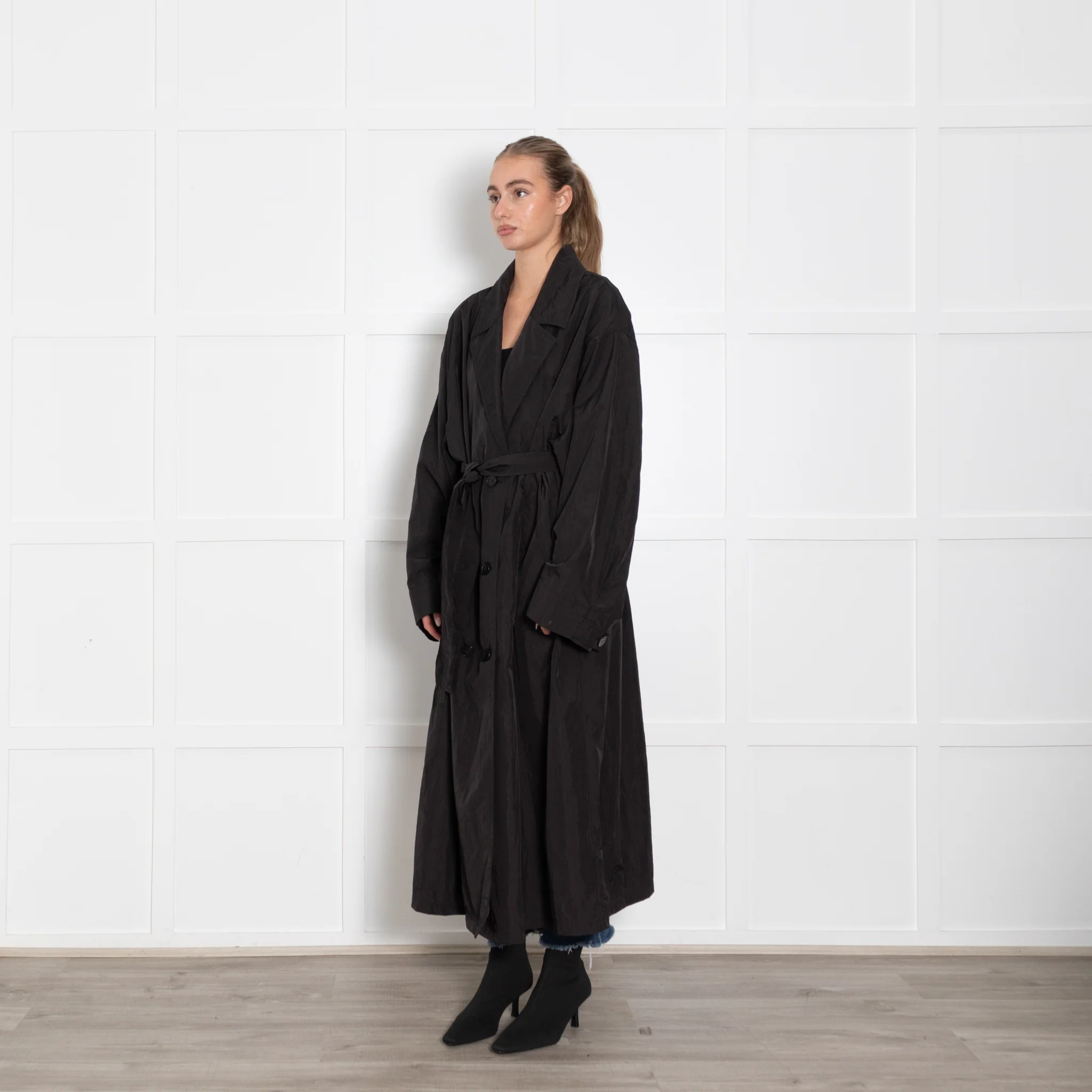 The Frankie shop long-sleeve black lightweight trench coat, featuring a classic collar, two spacious front pockets, a button-up front closure, and a single belt strap with a black belt.