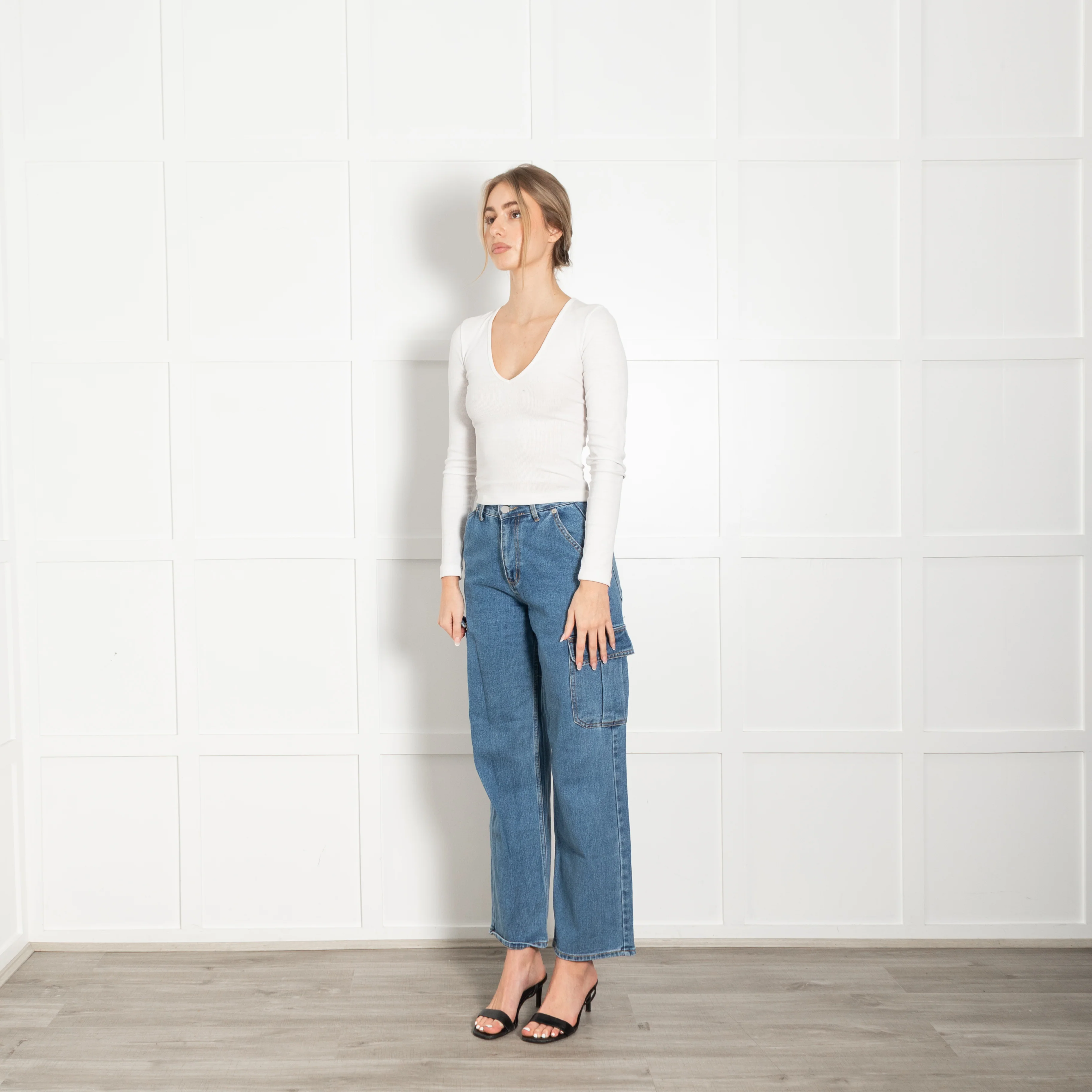 The Frankie Shop blue cargo jeans with two flap pockets and back pockets.