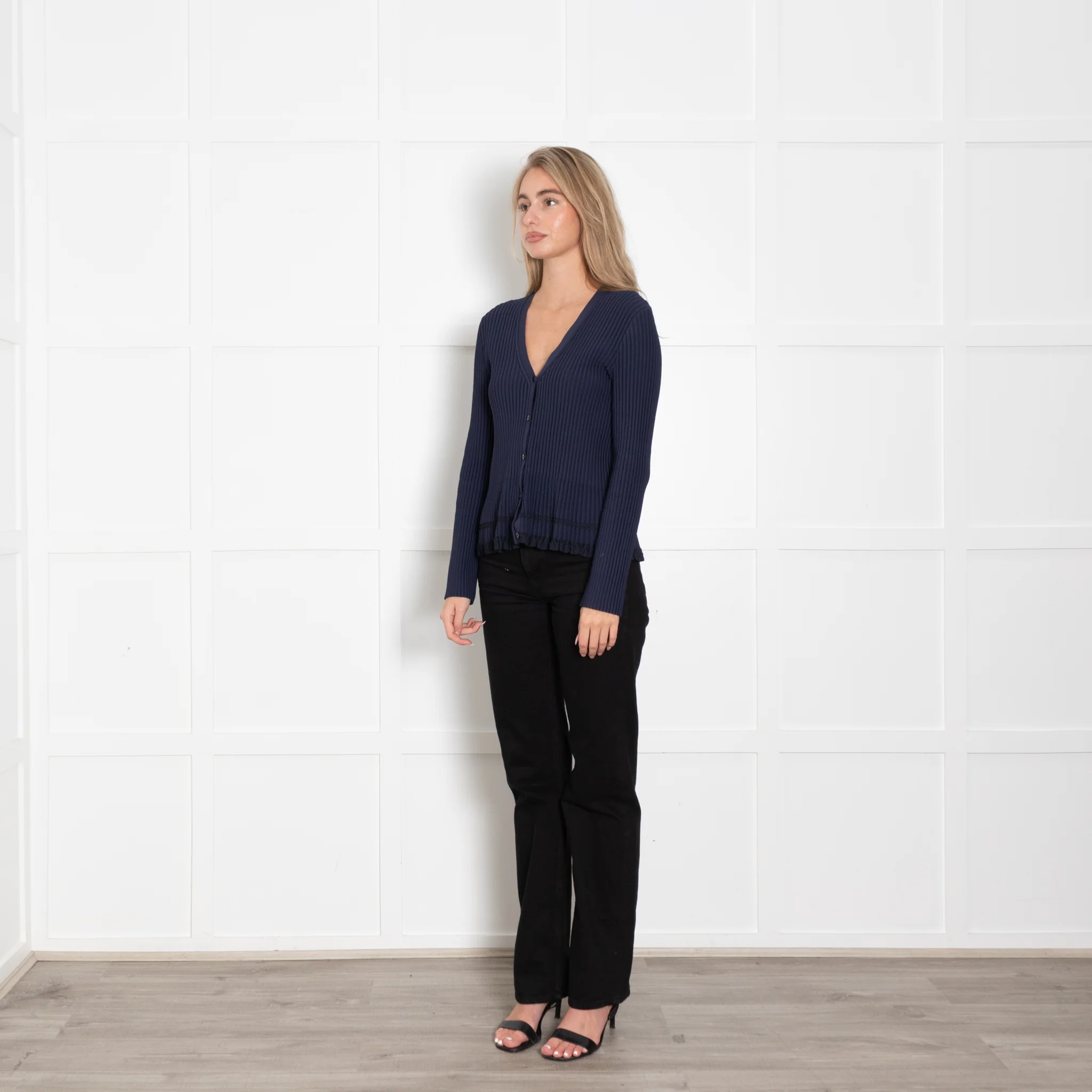 Theory navy long-sleeve ribbed cardigan featuring a stunning frill trim design, with a V-neckline and a button up front closure.