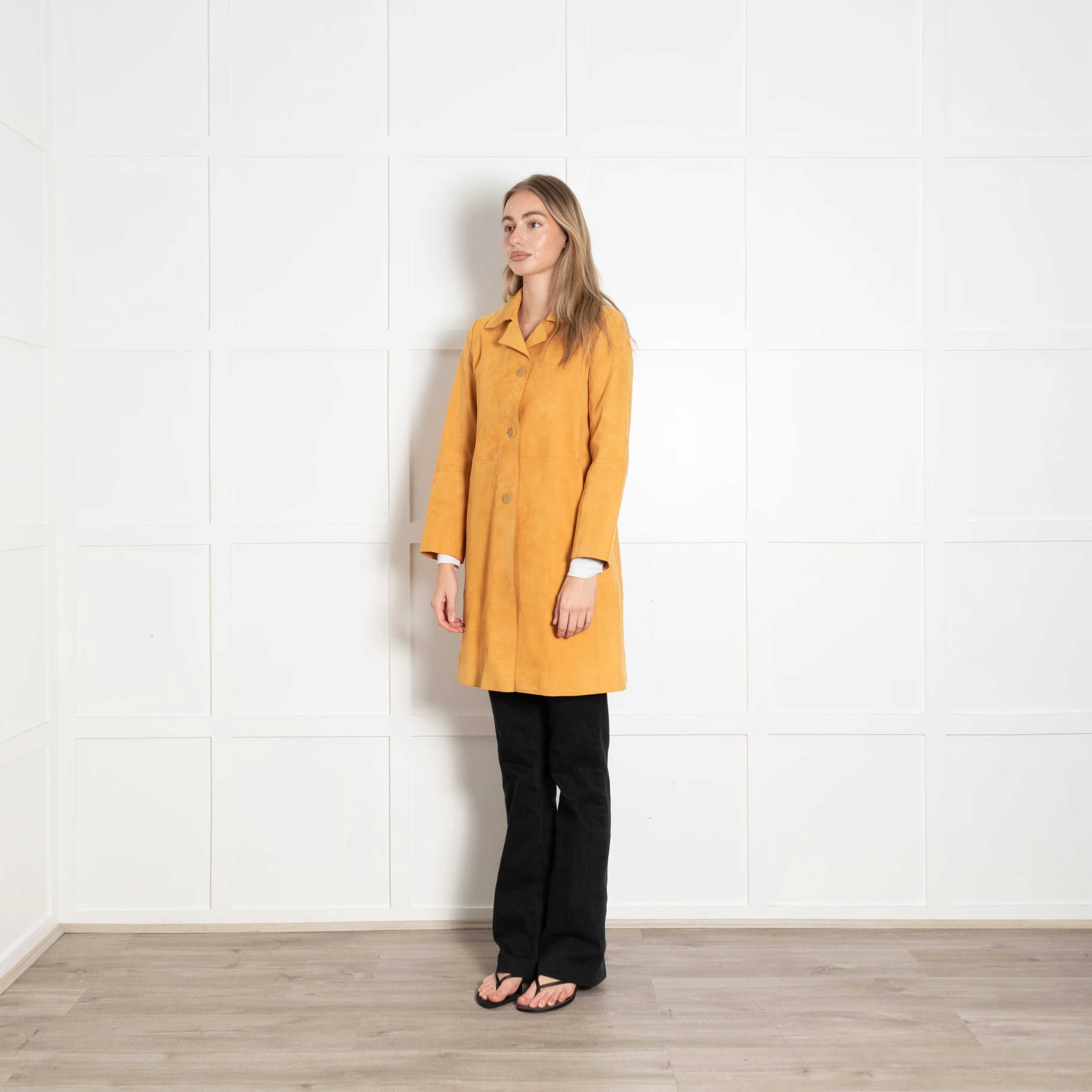 Theory tan orange/ brown suede coat with a collar and small lapel, long sleeves, a panelled design, and side slip pockets. This coat is half-lined.