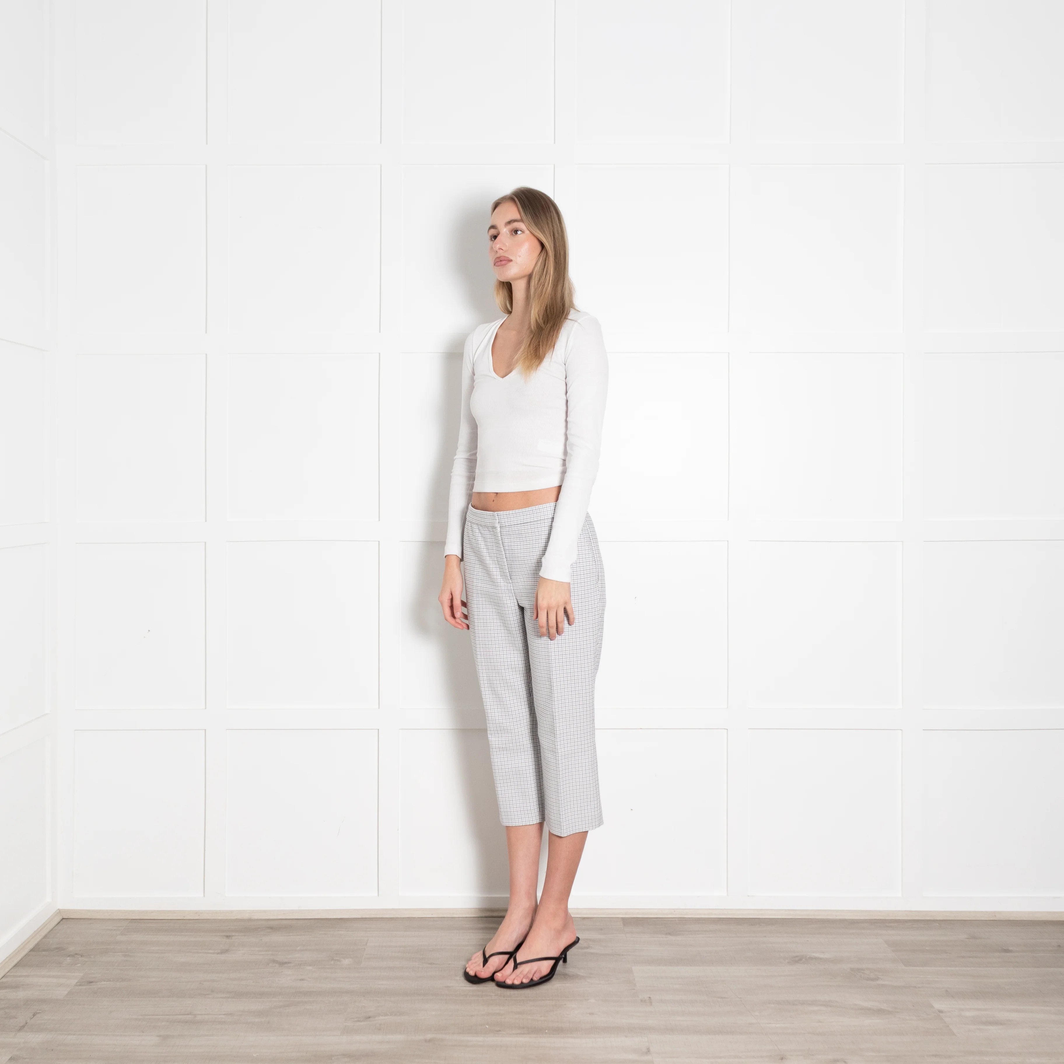 Theory white checked tailored trousers in a classic cropped silhouette. These structured trousers feature a subtle micro check pattern in neutral tones, making them a versatile choice for both workwear and weekend polish. Cut to sit at mid-waist with a slim, tapered leg, they’re finished with a concealed fastening and pressed creases through the front for a sharp, clean look. New with tags, these trousers are a timeless wardrobe staple.