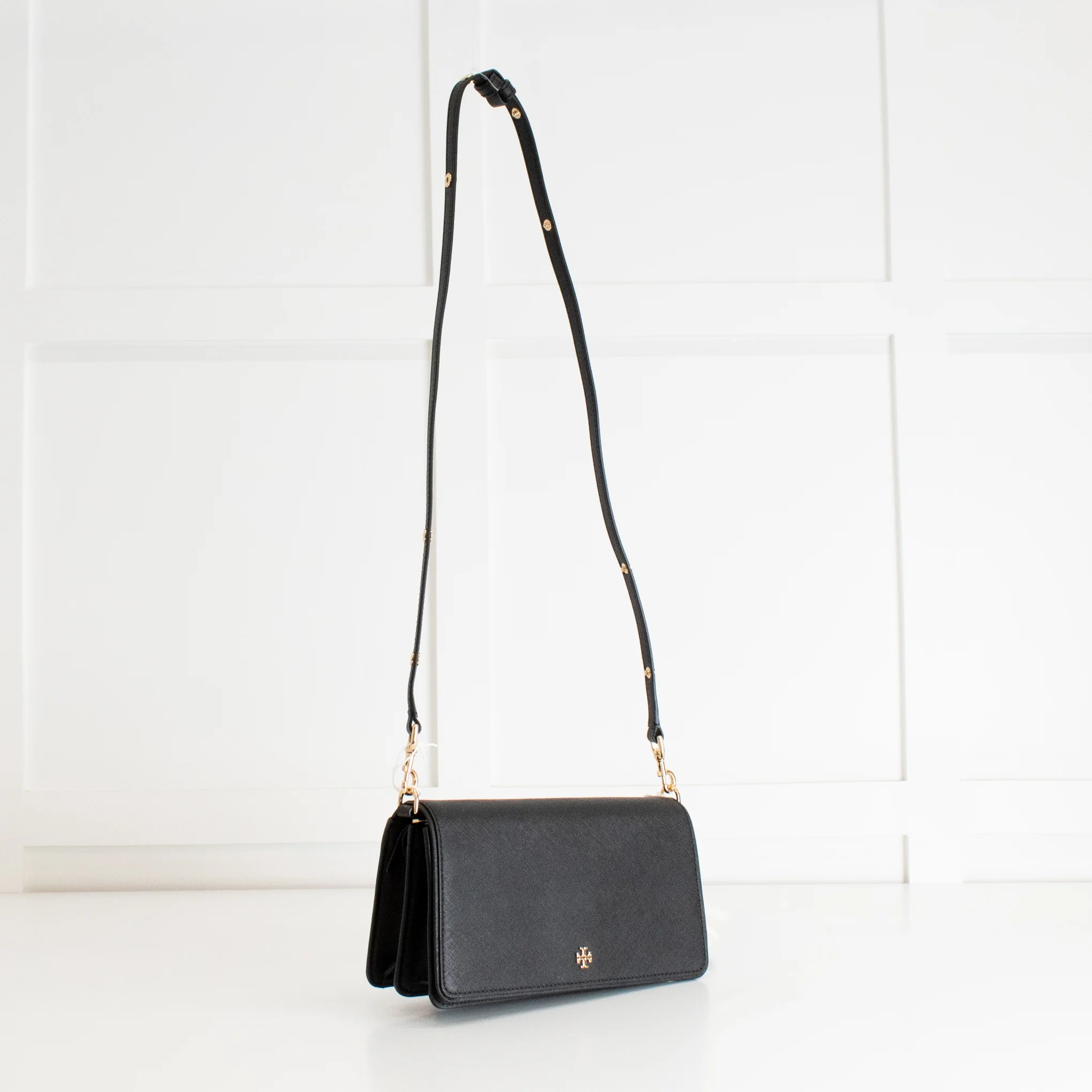 Tory Burch black grained coated leather Emerson convertible strap crossbody bag with a clip-on strap that can be worn on the shoulder to extend as a crossbody. Featuring gold-tone hardware, a front flap closure with a magnetic snap and a small T logo on the front. New with tags.