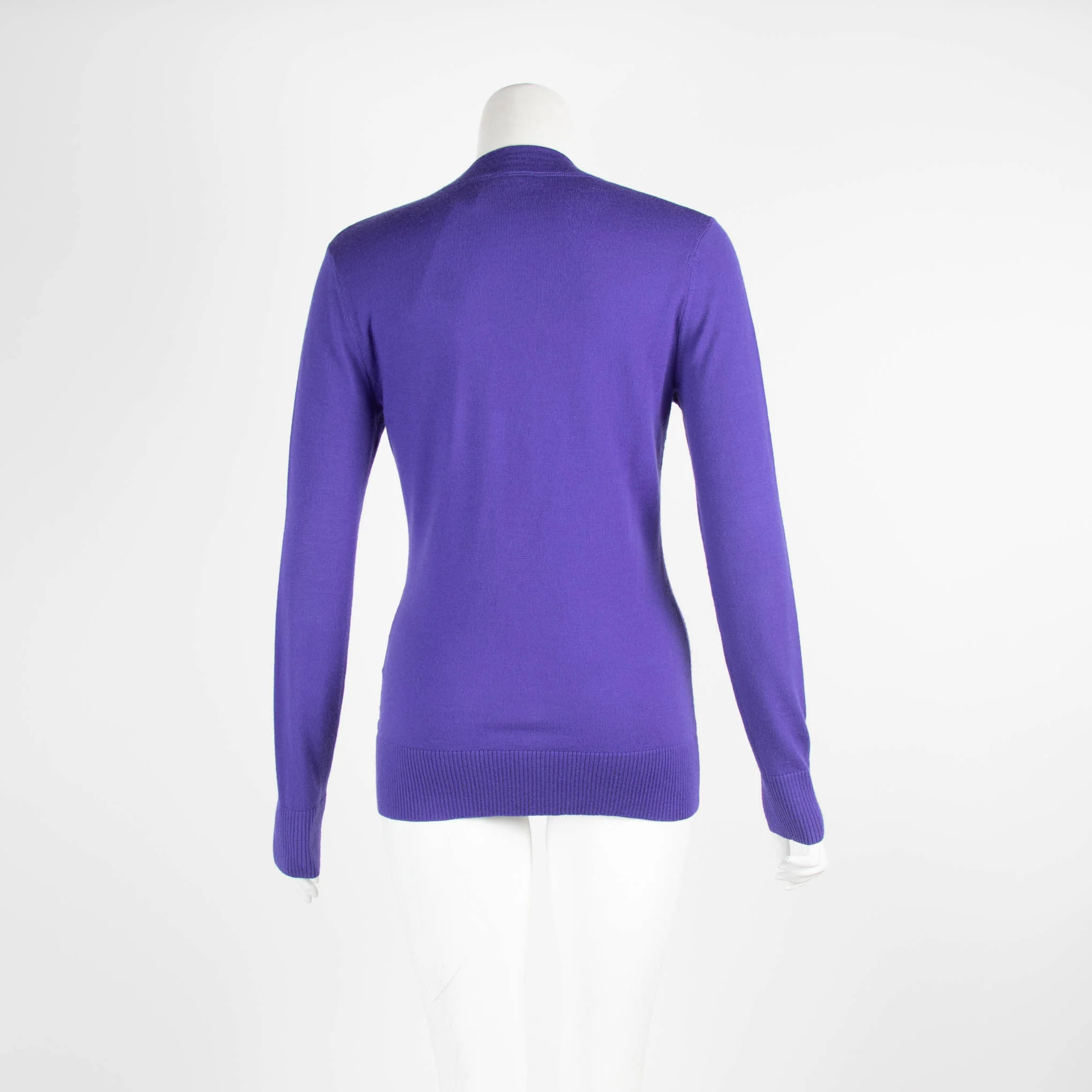 Tory Burch purple merino wool cardigan, with gold logo embossed buttons.
