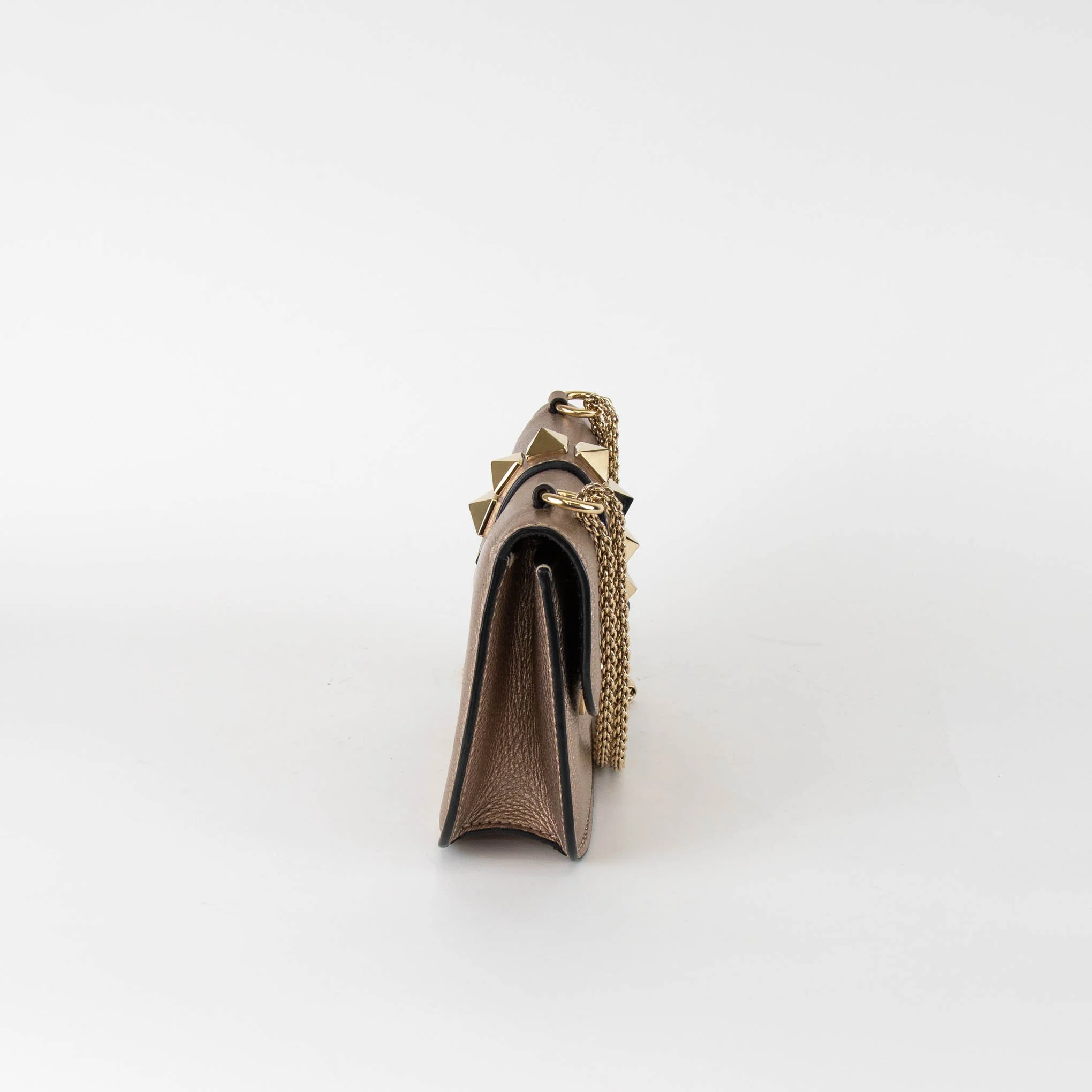 Valentino Garavani pale gold/ bronze metallic 'Glam Lock' crossbody bag with gold-tone hardware, a metal chain strap, large rock stud embellishments, a front flap, and a pinch lock closure. This bag opens onto a suede-lined interior with one side slip pocket, and one interior zipped pocket.