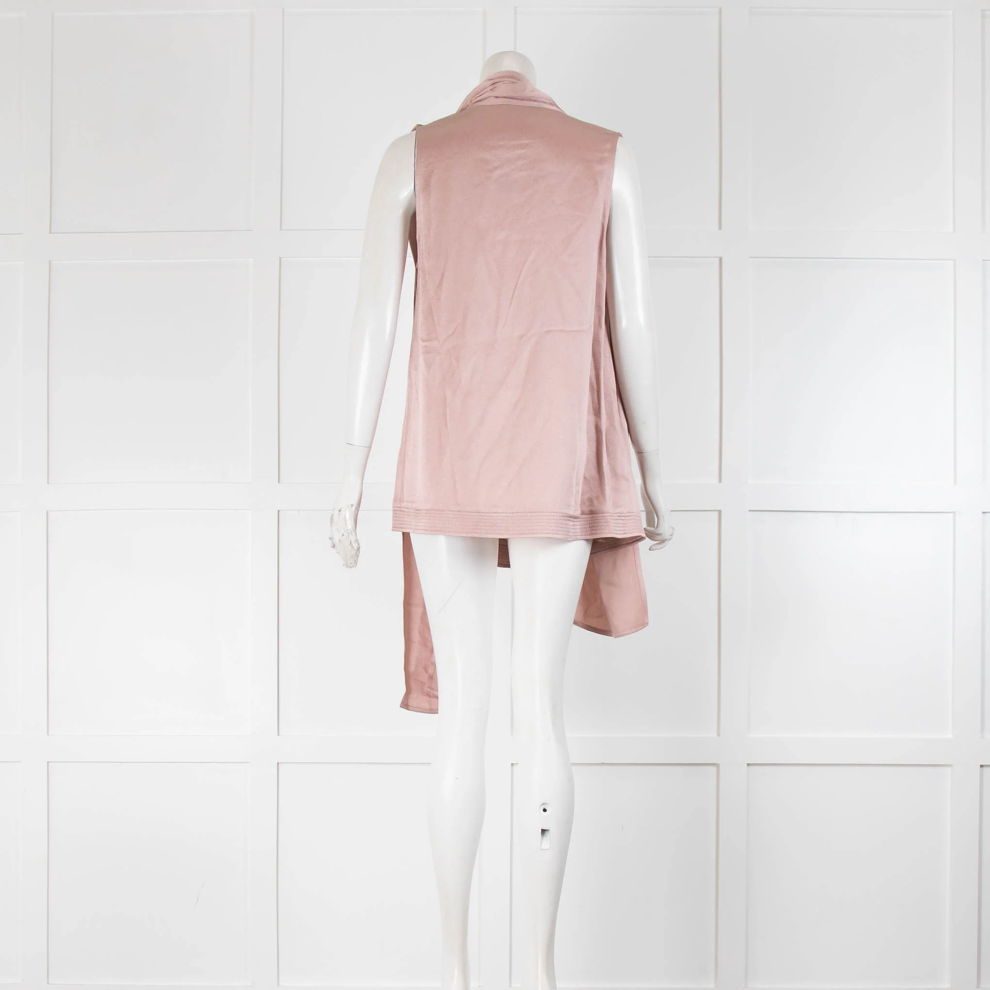 Valentino pink satin sleeveless top with hand-tied bow detail at the neck, a cowl-draped panel, and decorative topstitching.