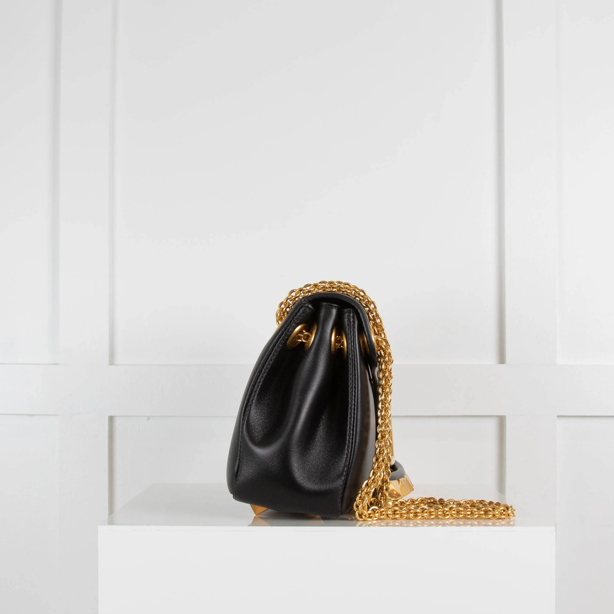 Valentino black leather Stud Sign shoulder bag. Crafted from soft smooth leather, with gold-tone hardware, and signature stud detailing throughout. With metal chain shoulder straps that can be adjusted to be worn cross-body, and have been finished with a studded leather shoulder pad. Has the signature V logo on the fold-over magnetic closure, studded base protectors, and two main compartments separated by a zipped pocket and one small side slip pocket. Accompanied by the original dust bag.