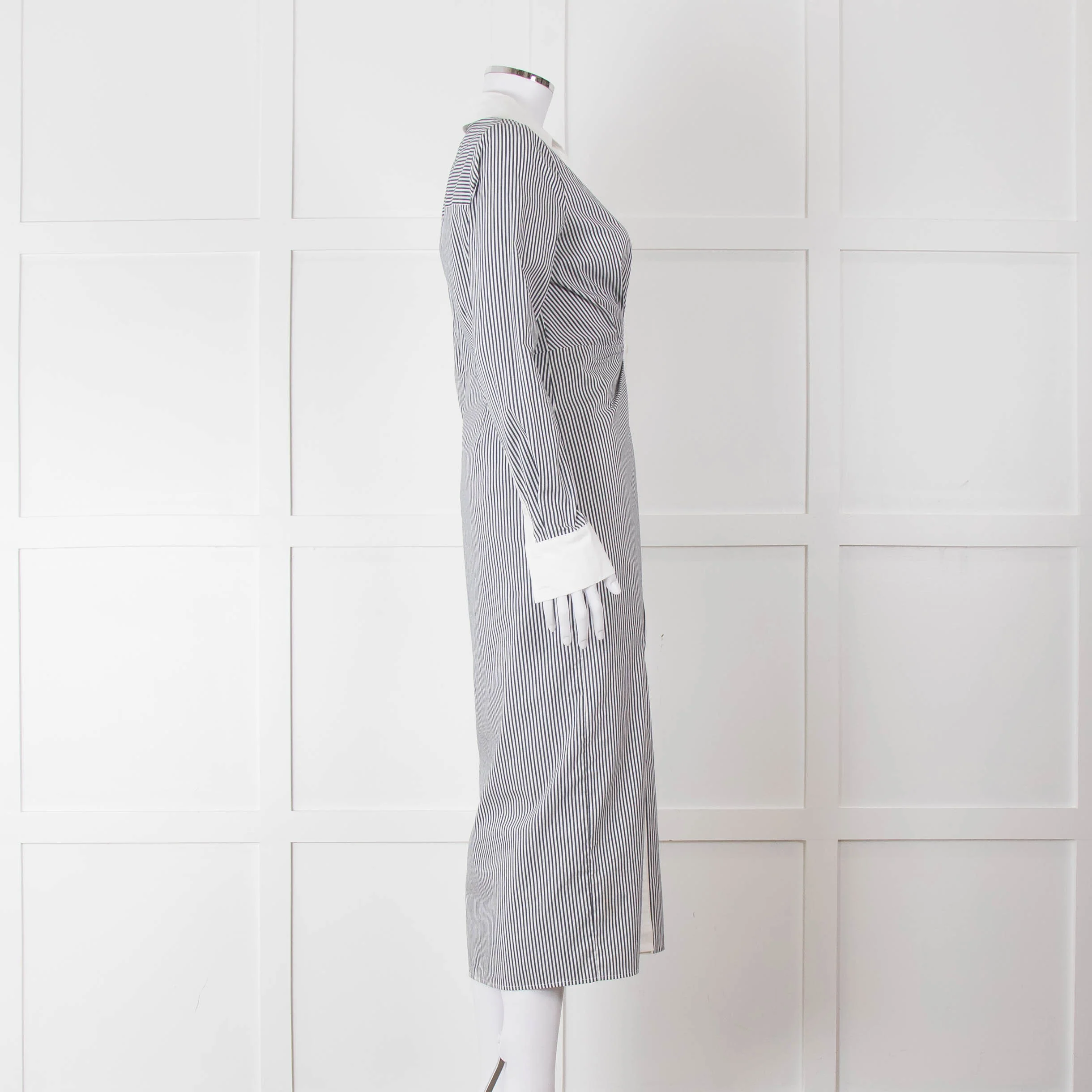 Veronica Beard white grey striped long shirt dress with white trim detailing, long sleeves, buttoned cuffs, ruching into the waist, and a button-up front.