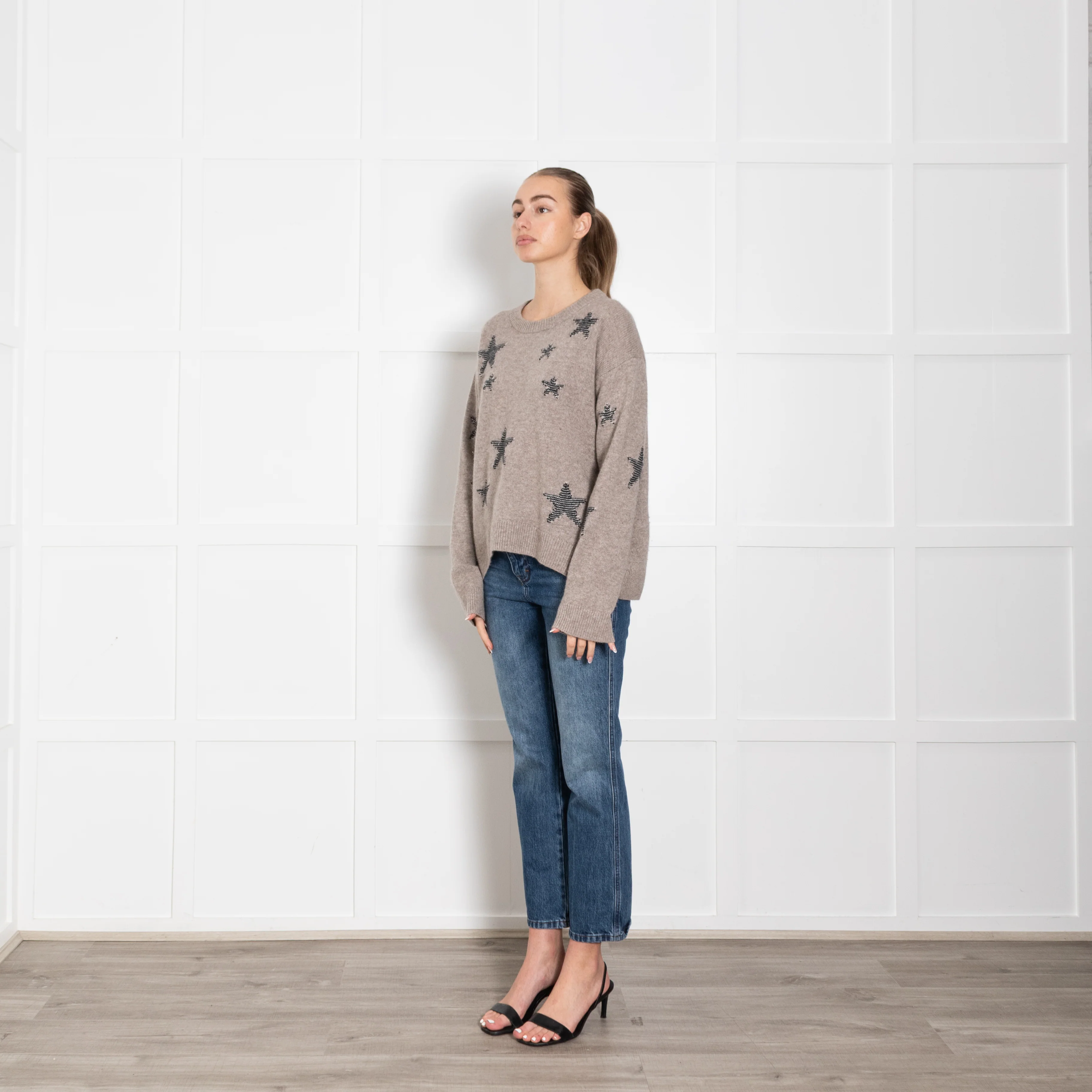 Zadig & Voltaire Preloved Markus Stars beige cashmere jumper with a rounded neckline and ribbed trims.