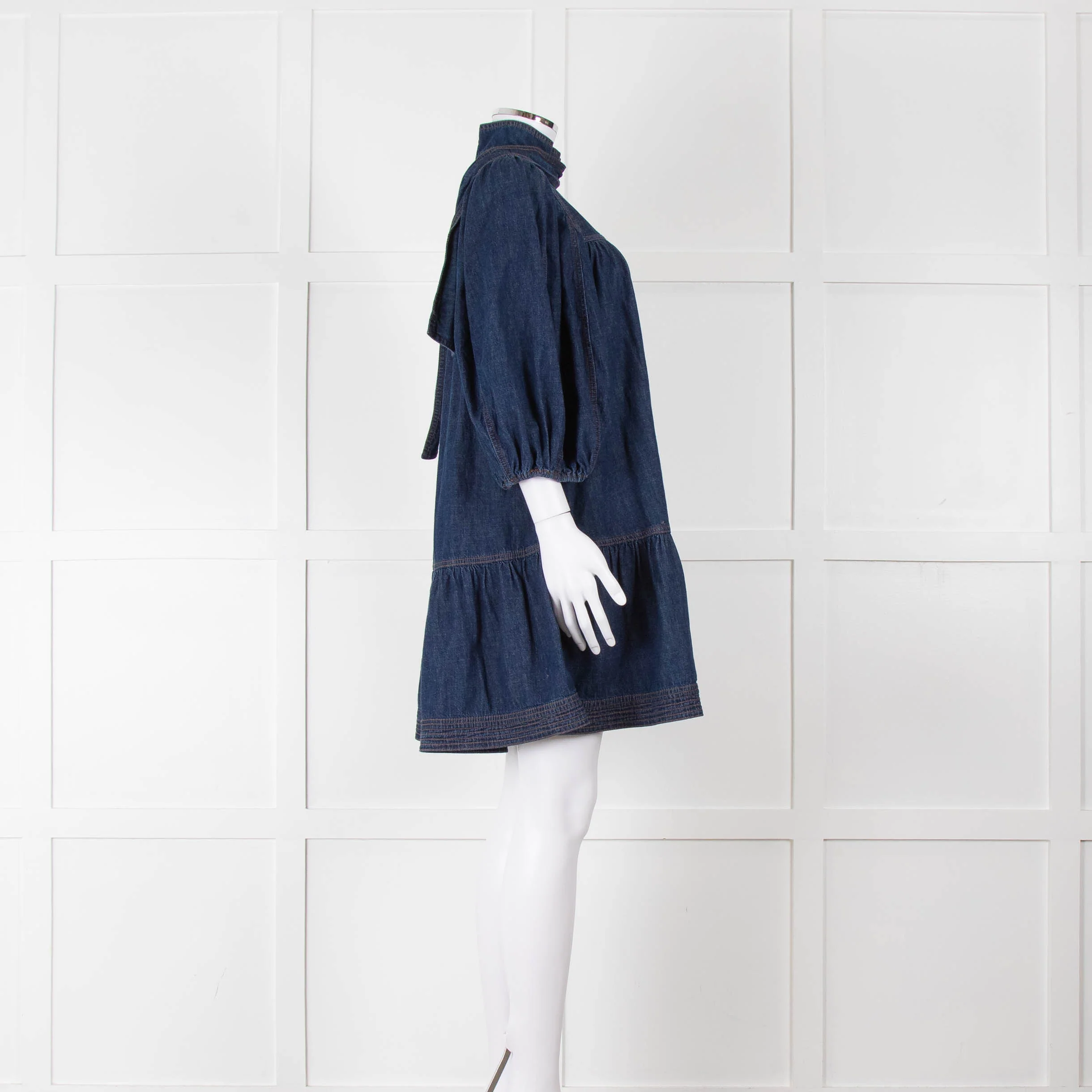 Zimmermann dark denim gathered mini dress with a high neckline, cropped puffed sleeves, contrast topstitching, side slip pockets, and an asymmetric buttoned front.