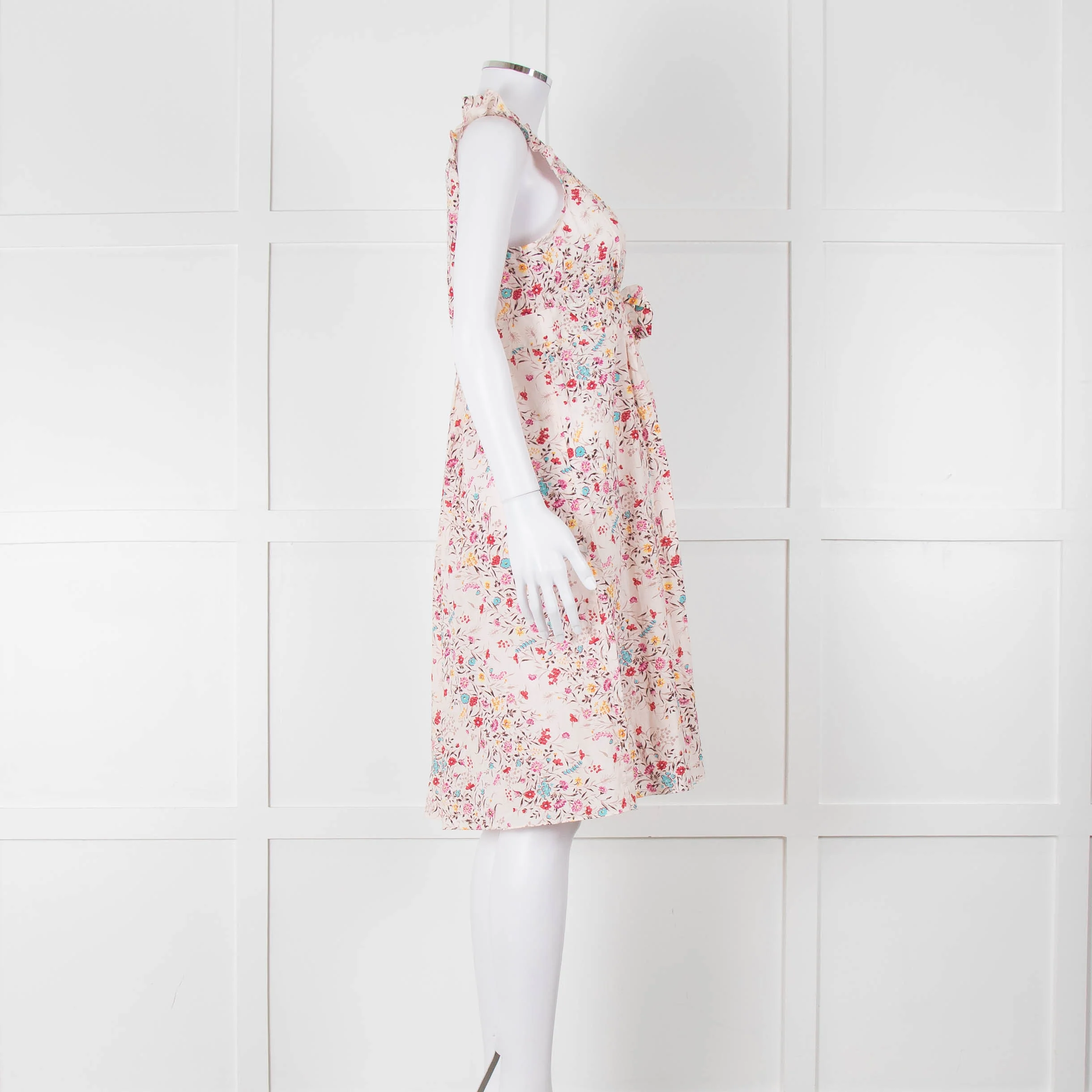 Zimmermann pale pink floral print dress with frilled trim detailing, a V-shaped neckline, pleating into the waist, and a front bow.