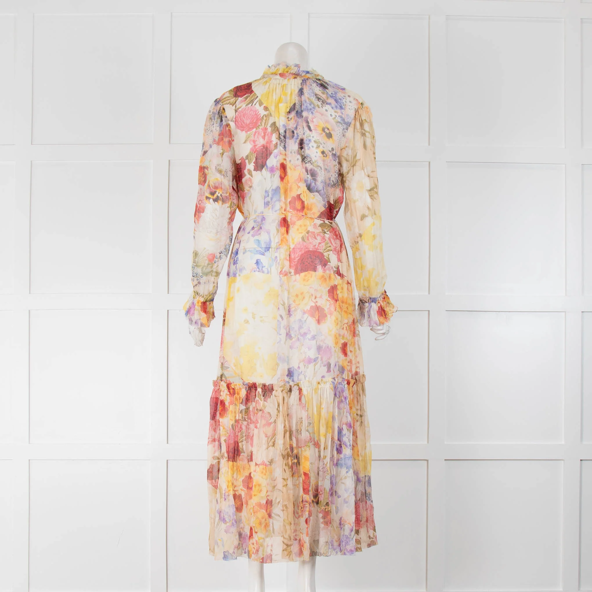 Zimmermann yellow and red 'Wonderland' floral print silk chiffon midi dress with a deep ruffle along the hem, long sleeves, elasticated cuffs, a removable slip dress, and frill trim around the notch neckline.