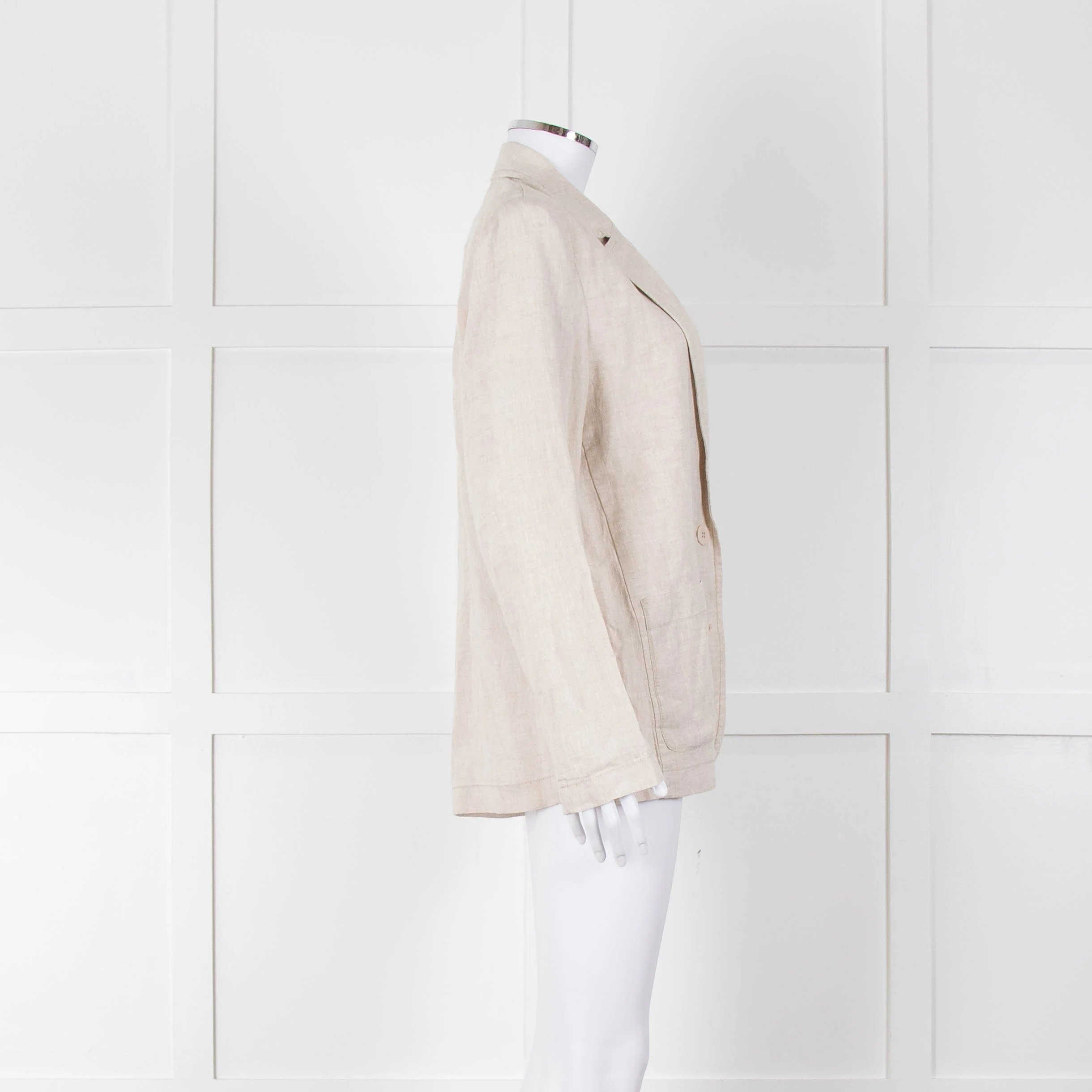 Zyga Linn Laundry beige linen relaxed unlined blazer-style jacket with two buttons fastening the front, two patch pockets, long sleeves, a notch collar and lapel, and a small single breast pocket.